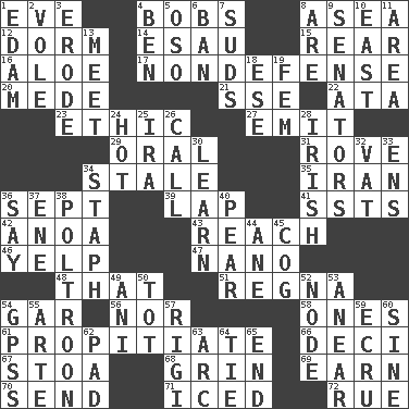 ACROSS 1. First lady 4. Moves up and down 8. Toward the sea 12. Dormintory (informal) 14. Son of Isaac 15. Bring up, as a child 16. _ vera 17. Unrelated to defense, as in spending 20. Ancient Persian 21. Compass dir. 22. _ moment's notice (2 wds.) 23. Value system 27. Give off 29. Spoken 31. Be footloose 34. Having lost freshness 35. SW Asia republic 36. Back-to-school mo. 39. Pet locale 41. Fast planes 42. Small Philippine buffalo 43. Arrive at 46. Sharp bark 47. Billionth: prefix 48. Not this but _ 51. Rain (Swedish) 54. Slender fish 56. Or not 58. Washington bills 61. Conciliate 66. Tenth: prefix 67. Portico 68. Smile widely 69. Merit 70. Post 71. On the rocks 72. Regret DOWN 1. Dutch treat 2. Short-tailed, large-bodied rat 3. Eat (away) 4. Benjamin's nick name 5. Bear (Spanish) 6. Prohibit 7. Soap bubbles 8. "We ___ not amused" (Victoria) 9. Legislators 10. Compass direction 11. Length times width 13. Confront 18. Compass dir. 19. Opposite of masc. 24. Being at a high temperature 25. Retirement account (abbr.) 26. Give a ring to 28. From or relating to Ireland 30. Acquire or gain knowledge or skills 32. Large container 33. Followers of ems 34. Staphylococcus 36. Declare 37. Compass dir. 38. Coward 40. Lightbulb-shaped fruit 44. One (Scot) 45. Gear tooth 49. Black tropical American cuckoo 50. Small child 52. Connecting point 53. Approach 54. Global Positioning Systems (abbr.) 55. Johnson of "Laugh-In" 57. Swiss mountan, "Queen of the Mountains" 59. Shade of tan 60. Trig term 62. Groovy apt. 63. Curve 64. Standoff 65. Conclusion