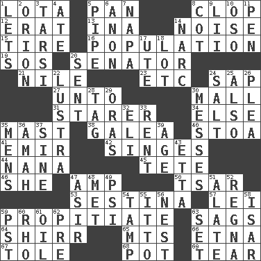 ACROSS 1. Globular water bottle used in Asia 5. Baking dish 8. Hoof sound 12. Part of Q.E.F. 13. _ tizzy (2 wds.) 14. Annoying sound 15. Become fatigued 16. Census information 19. Distress signal 20. Elected representative 21. The longest river in the world 23. And so on (abbr.) 24. Plant excrement 27. To (old English) 30. Shopping center 31. A viewer who gazes fixedly 34. Otherwise 35. Vertical spar for supporting sails 38. An organ shaped like a helmet 40. Portico 41. Independent ruler or chieftain 42. Scorches 44. Nanny 45. False hair 46. A female animal or person 47. Electrical Unit 50. Russian ruler of old 53. French poetic form 57. Luau accessory 59. Conciliate 63. Droops 64. Bake eggs in their shells 65. Mountains (abbr.) 66. Inactive volcano in Sicily 67. Lacquered or enameled metalware 68. Plant holder 69. Pull into pieces DOWN 1. Allows 2. Constellation of myth 3. Tarsus (plural) 4. Had dinner 5. Corncob 6. At once, immediately (arch.) 7. California wine valley 8. Small bed 9. Cards in a Roman deck? 10. Bear (Spanish) 11. Animal enclosure 14. Drug cop 17. Shoshoni 18. Car dealer's back yard 20. Transmitted 22. A period of five years 24. Table seasoning 25. In addition 26. Entreaty 28. Label 29. Mouths or openings 30. Makes clutter 32. Connecticut Ivy Leaguer 33. Monthly bill 35. Not women's 36. Wet nurse 37. Trig term 39. Ripen 43. Singer James 47. SW Saudi Arabia district 48. Was introduced to 49. Air pressure measure (abbr.) 51. Having winglike extensions 52. Rain (Swedish) 54. Pack (down) 55. "Tell ____ the Marines!" 56. A home for chicks 58. Austrian river, tributary to the Danube 59. Pacific Standard Time (abbr.) 60. 17th letter of the Greek alphabet 61. Petroleum 62. Before (prefix) 63. Arrange properly for use