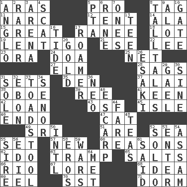 ACROSS 1. Caspian sea tributary 5. Adept person 8. Label 11. Drug cop 12. Portable shelter 14. Wing 15. Relatively large 17. Indian princess (variant) 18. Car dealer's back yard 19. Small, flat, pigmented spot on the skin 21. Compass dir. 22. Area sheltered from the wind 23. Mouth or opening 24. ___ good deed 25. Fish or hair follower 27. Shade tree 28. Settles 31. Puts into a specified state 35. Lair 37. Mountain range southwest of Kyrgyzstan 38. Mitch Miller's instrument 39. To separate or throw off 41. Peachy ____! 42. Grant temporary use of 43. Order of Saint Francis (abbr.) 45. Capri or Wright 46. Inside; within (prefix) 47. Feline 49. Indian title of respect (Mr.) 51. "We ___ not amused" (Victoria) 52. Ocean 55. Arrange properly for use 57. ___ Haven, CT 60. Thinks logically 62. Wedding promise 63. _____ steamer (cargo ship) 65. Table seasonings 66. River (Sp.) 67. Old wives' tales, e.g. 68. It may be bright or harebrained 69. Snakelike fish 70. Fast jet (abbr.) 71. Dormintory (informal) DOWN 1. White American of non-Hispanic descent 2. Less widely known 3. Sports stadium 4. Get outta here! 5. Parent Teacher Association (abbr.) 6. French philosopher Descartes 7. Washington bills 8. Baron Munchausen's specialties 9. _ vera 10. Yard entry 13. Adolescent 16. Periodic rise and fall of the sea level 17. Wanderer 20. Aureate 26. 1973 Nobel Price Winner (Physics) Leo 29. Highlander 30. Trig term 31. Flatfish 32. Inky black, to poets 33. Inedible or poisonous agaric 34. Sir (Sp.) 36. Modern: prefix 40. Fortification 44. Conductor's collection 48. Beverages made from leaves 50. International (abbr.) 52. Twentieth part of a lira 53. Keyboard key 54. Indian state 55. The founder of a family 56. Singer Brickell 58. Greek god of love 59. Armed conflicts 61. Stated 64. Was introduced to