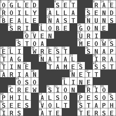 ACROSS 1. Stared at amorously 6. Put into a specified state 9. Actress Charlotte 12. Agitated, as a liquid 13. Silent film actress Nazimova 14. Transmit 15. Memphis, Tenn. Street 16. Political cartoonist Thomas 17. Religious women 18. Indian title of respect (Mr.) 19. Ear part 20. Went 21. Baking chamber 23. RI univ. 24. Portico 25. Catcalls? 28. Connecticut Ivy Leaguer 30. Take or capture by force 34. Fastener 35. Label 36. Brizilian seaport 38. Lyricist Gershwin 39. Prong on a fork 41. Corrects by punishment or discipline 43. Fast jet (abbr.) 44. Believer in; advocate of (suffix) 46. Remaining after all deductions 48. Bear (Spanish) 49. Actor's bit 50. Group working together 51. The Jewish people; Israel 53. _ de Janeiro 56. Silvers or Donahue 57. In addition 58. Mexican monetary units 60. Perceives with the eye 61. Electrical Unit 62. Staphylococcus 63. Big collection agency 64. Had dinner 65. Laconic DOWN 1. Globe 2. Leaves 3. One who doesn't tell the truth 4. American author Paul (1891-1958) 5. Color 6. Broad, flat, thick piece 7. Otherwise 8. Make lace 9. One who advocates reunion 10. Queen of England 1702-14 11. Begley and Asner 13. Soon (poet.) 14. Sounds asleep 19. Acquire or gain knowledge or skills 20. Chewing product 22. Promise 24. Seigniories (variant) 26. Armed conflicts 27. Petty quarrel 28. Singer James 29. Den 31. Erode 32. R.R. building 33. Scottish cap 37. Soviet premier 1918-24 40. Artist's stands 42. Elected rep. 45. At this time 47. Cigar-shaped 49. Spoils 50. "Mermaids" star 51. Slit 52. Small island 54. Austrian river, tributary to the Danube 55. I made a mistake 56. 23rd letter of the Greek alphabet 57. Actress Gardner 58. Pacific Standard Time (abbr.) 59. A female animal or person