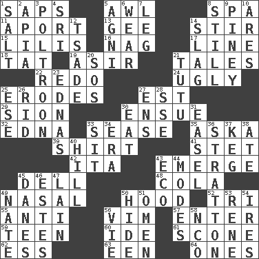 ACROSS 1. Plant excrements 5. Leather borer 8. Health resort 11. To the left, to Queeg 13. Unit of force equal to gravity 14. Tumult 15. Ms. Damita and namesakes 16. Tired old horse 17. Actor's bit 18. Make lace 19. SW Saudi Arabia district 21. Falsehoods 22. Redecorate 24. Repulsive 25. Eats (away) 27. Eastern Standard Time (abbr.) 29. The Jewish people; Israel 30. Take place subsequently 32. Pulitzer Prize-winning author Ferber 33. Gospel singer Marvin 35. "____ silly question..." 39. Chest covering 41. Proofreading order 42. Call ___ day 43. Develop 45. Small valley 48. Root beer relative 49. Rhinal 50. Parka part 52. Three (prefix) 55. Against 56. Zeal 57. Keyboard key 59. Adolescent 60. Binary compound 61. Biscuitlike quick bread 62. Curvy letter 63. Car or cant ending 64. Singles DOWN 1. Table seasoning 2. Capital of Western Samoa 3. Characterized by complete cowardliness 4. _ Lanka 5. Hindu god of fire 6. Put on (as clothing) 7. Part of a journey 8. Free of sound 9. Abounding in pines 10. Ancient Greek god of war 12. Sadhe (variant) 14. Volcanic refuse 20. Mayday 21. Ballerina skirt 23. Ferber et al. 25. Compass dir. 26. To free from 27. Followers of ems 28. Compass dir. 30. Consume 31. Artist's stand 33. Be seated 34. Epoch 36. Ski resort town in Vermont 37. Barrel 38. Had dinner 40. Land elevation 43. Environmental prefix 44. Methods 45. Natives or inhabitants of Denmark 46. _____ Park, CO 47. (Had) reclined 49. Nathan's nickname 50. Flintstone garb 51. Sign of something about to happen 53. French philosopher Descartes 54. Angers 56. Compete 58. Non-commissioned officer (abbr.)