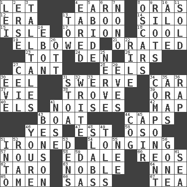 ACROSS 1. Allow 4. Merit 8. Mouths or openings 12. Period 13. Off limits 14. Grain storage tower 15. Capri or Wright 17. Greek mythologigal hunter 18. Calm and collected 19. Shoved, as through a crowd 21. Spoke pompously 23. Small child 24. Lair 26. Big collection agency 27. Patter 28. Snakelike fish 30. Snakelike fish 31. Turn aside suddenly 34. 4-wheeled motor vehicle 37. Compete 38. Collection of objects 39. Mouth or opening 40. Raised railways 41. Annoying sounds 42. Atlas unit 43. Water vessel 44. Balmoral and tarboosh 46. Affirmative reply 47. Eastern Standard Time (abbr.) 50. Bear (Spanish) 51. Pressed 54. Yearning 57. Horse sense 58. Peak District village in England 60. Vintage cars 62. Edible starchy tuberous root 63. Having high moral qualities 64. Compass dir. 65. Sign of things to come 66. Backtalk 67. Afternoon social gathering DOWN 1. Luau accessory 2. Celtic language 3. Baron Munchausen's specialties 4. Having ears or earlike features 5. Tolerate 6. Friend of Pooh 7. Words to Nanette 8. Motion picture awards 9. Debaucheries 10. _ vera 11. Disposed of to a purchaser 13. Pull behind 16. Inky black, to poets 20. Baseball player Mel 22. Cause heat under the collar 25. Boldness 27. To provide with a ceiling 29. Nights before holidays 30. Night before a holiday 31. Portico 32. Compose 33. Greek goddess of the dawn 34. Part 35. Ancient river in northeast Turkey 36. Hit sharply and swiftly 41. Characteristic smell of wine 43. Gillaume's butler role 44. Gear tooth 45. SW Saudi Arabia district 46. You are 48. Thick slices 49. For Whom the Bell _____ 51. To the inside or interior of 52. Wander 53. Cub Scout units 55. Born 56. Went 59. ___ good deed 61. Ocean