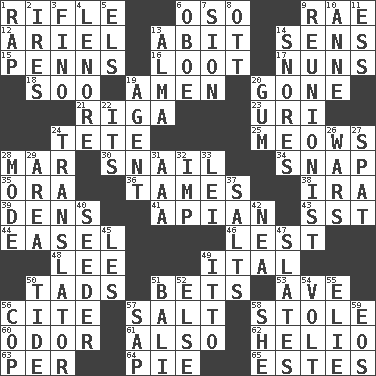 ACROSS 1. Ransack; plunder; pillage 6. Bear (Spanish) 9. Actress Charlotte 12. Satellite of Uranus 13. "This won't hurt ____!" 14. Elected reps. 15. Actor Sean's family 16. Spoils 17. Religious women 18. "Barney Miller" actor Jack 19. So be it 20. Went 21. Capital of Latvia 23. RI univ. 24. False hair 25. Catcalls? 28. Third mo. 30. Slow-paced one 34. Fastener 35. Mouth or opening 36. Makes less strong or intense 38. Retirement account (abbr.) 39. Hiding places for outlaws 41. Bee-related 43. Fast jet (abbr.) 44. Artist's stand 46. For fear that 48. Area sheltered from the wind 49. Slanted text style (abbr.) 50. Small boys 51. Stakes 53. "___ Maria" 56. Quote 57. Table seasoning 58. Took without asking 60. Aroma 61. In addition 62. Sun: prefix 63. For each 64. Sliced dessert 65. _____ Park, CO DOWN 1. Strike 2. Angers 3. A pale, very dry sherry 4. Poe poem 5. Raised railways 6. Mitch Miller's instrument 7. The Jewish people; Israel 8. Baseball player Mel 9. One who advocates reunion 10. Queen of England 1702-14 11. Curvy letter 13. _ mater 14. Sounds asleep 19. Representative 20. Chewing product 22. ___ a Wonderful Life 24. Interpreter 26. Armed conflicts 27. Argument over a trivial matter 28. Method 29. Length times width 31. Auto club (abbr.) 32. Naughty child 33. Flowery wreath 37. Table seasonings 40. Sowing specialist 42. Teachers' org. 45. French article 47. Chalkboards 49. "Tell ____ the Marines!" 50. Event that recurs at intervals 51. Indonesian resort city 52. Otherwise 54. Electrical Unit 55. Writer Wiesel 56. Police officer (slang) 57. Plant excrement 58. A female animal or person 59. Greek goddess of the dawn