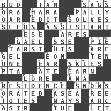ACROSS 1. Partially opened flower 4. Scottish cap 7. Settles 11. Mouth or opening 12. Hindu Mythology: god of death 13. Chummy 14. Rowing implement 15. Prepare for publication 16. Finds the solution 17. Bobsleighs 19. Helper 21. Compass dir. 23. Ancient Greek god of war 24. Highlander 25. Compass dir. 26. Sliced dessert 29. Tarsus (plural) 30. Part of HMS, perhaps 31. "We ___ not amused" (Victoria) 32. Set 33. A really long time 34. "___ Little Indians" 35. Single 36. Hearing organ 37. Atmospheres 40. Parent Teacher Assoc. 41. Had dinner 42. Merit 43. Old wives' tales, e.g. 45. Santa ___, CA 46. Dwelling 51. Frozen precipitation (plural) 55. Spoke pompously 56. At sea 58. Portuguese money of account (variant) 59. Hauls 60. Negative votes 61. Curve 62. SW Saudi Arabia district 63. Third day of the wk. 64. Allow DOWN 1. Scornful sounds 2. Mountain range 3. Have the gumption 4. Small boy 5. Roberta Peters solo 6. Floor protectors 7. Table seasonings 8. Inventor's middle name 9. Small, secluded valley 10. System (abbr.) 12. Makes clutter 13. Airs 16. Begets 18. Letter starter 20. Indian antelope 22. Biblical high priest 24. An organ shaped like a helmet 25. Dinah or Pauly 26. Eucharist need 27. Angers 28. Car or cant ending 29. Portable shelter 32. Republican Party 33. Ingested 36. Having ears or earlike features 37. Ocean 38. Sunflower state 39. SW Asia republic 43. 61 cubic inches 44. Lyric poems 46. Round or rotation of duties 47. Greek god of love 48. Suttee (variant) 49. Patter 50. Son of Isaac 52. Of the mouth 53. We are 54. Religious group 57. Sight organ