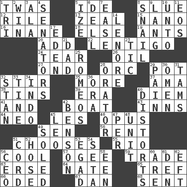 ACROSS 1. It was, poetically 5. Binary compound 8. Change direction abruptly 12. Cause heat under the collar 13. Ardor 15. Billionth: prefix 16. Lacking in sense or substance 18. Otherwise 19. Pismires 20. Find the sum of 22. Small, flat, pigmented spot on the skin 24. Pull into pieces 26. Lubricate 27. Southwest Nigerian state 28. The grampus (Milton) 29. Cooking vessel 32. Use a spoon 35. Greater amount 37. Wet nurse (var.) 38. Metal containers 39. Epoch 40. South Vietnam president (1954) 41. Added to 42. Water vessel 43. Lodging establishments 44. Modern: prefix 45. French article 46. Musical composition 49. Elected rep. 50. Monthly bill 51. Opts 55. _ de Janeiro 56. Calm and collected 57. Double curve, resembling the letter S 59. Barter 63. Celtic language 64. Nathan's nickname 65. Not kosher 66. Wrote a lyric poem 67. Daniel's nick name 68. Posted DOWN 1. Three (prefix) 2. Victory 3. In the manner of 4. Elected representatives 5. Ending with capital 6. Small valley 7. Relaxation 8. Slow-paced one 9. Long (Scottish) 10. To (old English) 11. Greek goddess of the dawn 14. Poe poem 17. Paradise 21. Male parent 23. Nervous spasm 25. Lover boys 28. Speaker 29. Ache 30. Sign of something about to happen 31. Scottish caps 32. Comedian Laurel of Laurel & Hardy 33. Prong on a fork 34. _ china 36. Mouth or opening 40. What propaganda does 42. Gillaume's butler role 45. Lion 47. For each 48. A single undivided whole 49. Having a sole or soles 51. Drawstring 52. Stockings 53. Mild oath 54. Stalk of a moss capsule 56. Corporate head (abbr.) 58. Car or cant ending 60. "We ___ not amused" (Victoria) 61. Lair 62. Newt