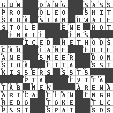 ACROSS 1. Chewing product 4. Mild oath, euphamism for damn 8. Backtalk 12. Adept person 13. Butter sub 14. Stricken, poetically 15. "Two Mules for Sister ____" 17. Comedian Laurel of Laurel & Hardy 18. A sleeping potion; an opiate (poet.) 19. Fur scarf 21. Compass dir. 23. Being at a high temperature 24. Maternal 26. Followers of ems 28. On the rocks 30. Modes 34. 4-wheeled motor vehicle 37. Unable to walk 39. Singer Brickell 40. One (Scot) 41. Contemptuous expression 43. Spanish title 44. Portico 46. Singer James 47. Fast jet (abbr.) 48. Smoochers 51. Fast planes 54. Parent Teacher Assoc. 55. Webber/Rice musical 58. Bar bill 61. ___ Haven, CT 63. Sports stadium 65. N. Chile seaport 67. Liveliness 71. Engineer (abbr.) 72. Redecorate 73. Puff or smoke 74. Affectionate concern, for short 75. Inconspicuous attention getter 76. Petty quarrel 77. Mayday DOWN 1. Global Positioning Systems (abbr.) 2. A salt of uric acid 3. Person of subnormal intelligence 4. Two (Sp.) 5. The first octave above the treble staff 6. Teachers' org. 7. Went 8. Compass dir. 9. Nanny 10. Grain storage tower 11. Proofreading order 16. Jai ____ 18. Scratch 20. And so on (abbr.) 22. Born 25. Snakelike fish 27. A female animal or person 29. Natives or inhabitants of Denmark 30. Confronts 31. Probability 32. "Vaya con ____" 33. Emitted 34. Keg 35. Opposed to 36. Vintage cars 38. Was introduced to 42. Raze (variant) 45. Viper 49. Inactive volcano in Sicily 50. Actress Charlotte 52. Federal power corp. 53. The founder of a family 56. Portable shelters 57. White American of non-Hispanic descent 58. Canvas cover 59. Ancient Greek god of war 60. Auction offers 62. Soaks 64. Curves 66. Small bed 68. Chop off 69. Alias (abbr.) 70. Fish or hair follower