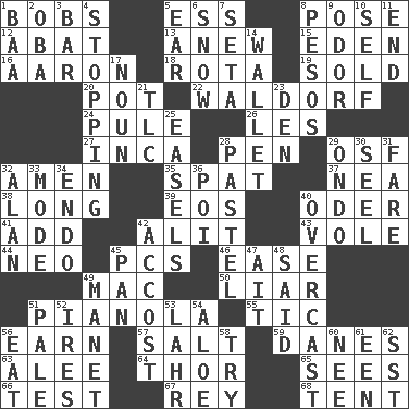 ACROSS 1. Moves up and down 5. Curvy letter 8. Airs 12. Blind as ____ 13. Afresh 15. Locale of original sin 16. Composer Copland 18. Round or rotation of duties 19. Disposed of to a purchaser 20. Cooking vessel 22. Apple salad 24. Whimper 26. French article 27. South American Indian 28. Animal enclosure 29. Order of Saint Francis (abbr.) 32. So be it 35. Petty quarrel 37. Teachers' org. 38. Yearn 39. Greek goddess of the dawn 40. River in Europe 41. Increase 42. Set down 43. Short-tailed, large-bodied rat 44. Modern: prefix 45. Personal Computers (abbr.) 46. Comfort 49. Apple computer (short form) 50. One who doesn't tell the truth 51. Player piano 55. Nervous spasm 56. Merit 57. Table seasoning 59. Natives or inhabitants of Denmark 63. Toward shelter 64. Son of Odin 65. Perceives with the eye 66. Trial 67. Marina Del _, California 68. Portable shelter DOWN 1. Sound made by sheep 2. Chief or king in Benin or Nigeria 3. Oblong piece of solid material 4. Obstructing or blocking passage 5. Ewer handle 6. Frozen precipitation 7. Bristle 8. Mexican monetary units 9. Aroma 10. Automatically 11. Conclusion 14. Place for singles 17. Part of speech 21. Affectionate concern, for short 23. Lair 25. Artist's stands 28. Soft color 29. Southwest Nigerian state 30. Sew up the eyelids of hawks and falcons 31. Conductor's collection 32. ____ Jay Lerner 33. Method 34. Inside; within (prefix) 36. Luau course 40. Cloudy 42. Buttonhole 45. Baking dish 47. Small island 48. Stated 49. French painter Edouard 51. Light colored 52. Angers 53. Cowardly lion portrayer 54. Medicinal plant 56. Ingest 58. Attempt to accomplish something 60. Born 61. Car or cant ending 62. Fast jet (abbr.)