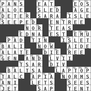 ACROSS 1. Zero-star reviews 5. Ingest 8. Greek goddess of the dawn 11. Medicinal plant 12. Downhill vehicle 14. Grow older 15. Prevent from occurring 17. "Two Mules for Sister ____" 18. Small island 19. Oozed 21. Main course 23. And not 25. Beverages made from leaves 26. Pulitzer Prize-winning author Ferber 27. Eastern Standard Time (abbr.) 28. Australian flightless bird 31. Writing tablet 33. Metal container 35. Small island 37. Indonesian resort city 38. Immediately 40. Helper 41. Having winglike extensions 43. Expire 45. To separate or throw off 46. Commissioned military rank (abbr.) 47. Also 50. 57 in ancient Rome 52. Russian ruler of old 53. HTML Container Element 54. Greek mezzo-soprano Agnes 56. Portable computer 61. Baby powder 62. Capital of Western Samoa 65. Typical standards 66. Cuckoo 67. Allows 68. Perceives with the eye 69. Passenger plane 70. Plant excrement 71. Portable shelter DOWN 1. Writing tablets 2. Toward shelter 3. Observe 4. Ooze 5. Curvy letter 6. Chicken ___ king 7. Cigar-shaped 8. Comfort 9. Stare 10. Perceive with the eye 13. Natives or inhabitants of Denmark 16. Tear apart 18. Big collection agency 20. Do not 22. Jacques of French films 24. Water falling in drops from the sky 26. Prepare for publication 28. Writer Wiesel 29. Ancient Persian 30. Shoshoni 31. Light colored 32. ____ Jay Lerner 34. Allow head to fall sleepily 36. Indian skirt 37. Container for groceries 39. Rampant 42. 90 degrees 44. Tending to cause great harm 48. Relating to the nose 49. Window treatments 51. "Terrible" tsar 52. Affectionate concern, for short 54. Object of repulsion 55. Set down 57. Mail 58. Relationship diagram 59. Sign of something about to happen 60. Inconspicuous attention getter 61. _ Mahal 63. Call ___ day 64. Cleo's killer