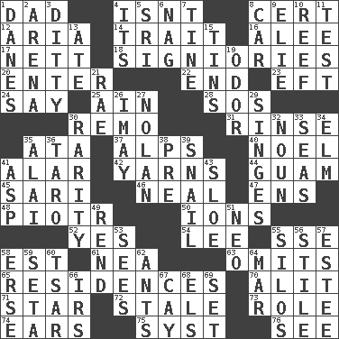 ACROSS 1. June honoree 4. Is not 8. Certainty 12. Operatic vocal solo 14. Distinguishing feature 16. Toward shelter 17. Remaining after all deductions 18. Seigniories (variant) 20. Keyboard key 22. Conclusion 23. Newt 24. Declare 25. The 18th letter of the Arabic alphabet 28. Distress signal 30. San ____ (Riviera town) 31. Remove soap 35. _ moment's notice (2 wds.) 37. High mountains 40. Christmas carol 41. Having or resembling wings 42. Tall tales 44. Island territory of the United States 45. Indian skirt 46. Be tempered by heat 47. Followers of ems 48. Peter (Polish) 50. Charged particles 52. Consenting reply 54. Area sheltered from the wind 55. Compass dir. 58. Eastern Standard Time (abbr.) 61. Teachers' org. 63. Leaves out 65. Dwellings 70. Set down 71. Play the lead 72. Having lost freshness 73. Hero or heavy, e.g. 74. Hearing organs 75. System (abbr.) 76. Perceive with the eye DOWN 1. Natives or inhabitants of Denmark 2. Sports stadium 3. Short, simple song 4. It is 5. Indian title of respect (Mr.) 6. Tired old horse 7. Prong on a fork 8. Auto 9. Writer Wiesel 10. Coral ridge 11. Trial 13. Had dinner 15. Airtight sealed metal containers 19. Aroma 21. Actress Charlotte 26. "If ____ say so..." 27. Pitcher Ryan 29. Scorches 30. Noteworthy scarcity 32. Part of speech 33. Oceans 34. Shade tree 35. Jai ____ 36. Pacific island yam 38. Before (prefix) 39. Slow-paced one 41. Cleo's killer 43. _ gin 49. Tear apart 51. Modern: prefix 53. Observes 55. Grain storage towers 56. Vertical member of a panel or frame 57. First name in cosmetics 58. Celtic language 59. Bristle 60. Russian ruler of old 62. Pismires 64. Impair 66. Big collection agency 67. Island 68. Raised railways 69. Put into a specified state