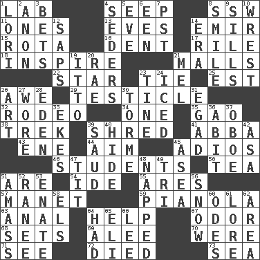 ACROSS 1. Experiment locale 4. Ooze 8. Compass dir. 11. Washington bills 13. Nights before holidays 14. Arab leader 15. Roll call or roster of names 16. Incision 17. Cause heat under the collar 18. Stimulate to action 21. Promenades 22. Play the lead 23. Standoff 25. Eastern Standard Time (abbr.) 26. Deep reverence 29. One of the two male reproductive glands 32. Cowboy competition 34. Single 35. E Mali city 38. Long journey 39. Fragment 41. Swedish rock group 43. Compass dir. 44. Direct toward a target or goal 45. Goodbye (Sp.) 46. SAT takers 50. Beverage made from leaves 51. "We ___ not amused" (Victoria) 54. Binary compound 55. Ancient Greek god of war 57. French painter Edouard 59. Player piano 63. Of or related to the anus 64. Aid 67. Aroma 68. Puts into a specified state 69. Toward shelter 70. Past tense of be (plural) 71. Observe 72. Passed on 73. Ocean DOWN 1. Australian parrot (variant) 2. At once, immediately (arch.) 3. Stakes 4. Spring feasts 5. First lady 6. Car or cant ending 7. Pacific Standard Time (abbr.) 8. Grin 9. Beverly of Met fame 10. Take or capture by force 12. Plant excrements 14. Period 19. "Tell ____ the Marines!" 20. Actress Charlotte 21. Cartoonist voice _ Blanc 23. Prong on a fork 24. On the rocks 26. Nonscientific branch of learning 27. Had on 28. Genesis locale 30. Singer Mel 31. Mild oath 33. Makes supply last 36. "This won't hurt ____!" 37. Mitch Miller's instrument 39. Saudi Arabian king (1953-1964) 40. Flintstone garb 42. White ___ sheet 45. At sea 47. Teat (slang) 48. Slept 49. Three (prefix) 51. Collect or gather 52. The wife of a rajah (variant) 53. Maternal 56. Overwhelm 58. Raised railways 60. Lyric poems 61. Old wives' tales, e.g. 62. Length times width 64. Possessed 65. Connecticut Ivy Leaguer 66. Area sheltered from the wind