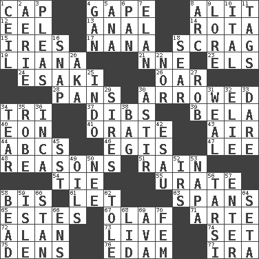 ACROSS 1. Head covering 4. Open wide 8. Came down and settled, as after flight 12. Snakelike fish 13. Of or related to the anus 14. Roll call or roster of names 15. Angers 17. Nanny 18. Strangle with an iron collar 19. Woody, climbing, usually tropical plant 21. Compass dir. 23. Raised railways 24. 1973 Nobel Price Winner (Physics) Leo 26. Rowing implement 28. Baking dishes 30. Moved like an arrow 34. Three (prefix) 37. Claim 39. Actor Lugosi 40. Period of immesurable duration 41. Speak pompously 43. Wind 44. Lettered men learn these first 46. Armor plate that protects the chest 47. Area sheltered from the wind 48. Thinks logically 51. Precipitation 54. Neckwear 55. A salt of uric acid 58. Twice 61. Allow 63. Connects, as a bridge 65. _____ Park, CO 67. Norwegian king 71. Johnson of "Laugh-In" 72. Actor Alda or Thicke 73. Not recorded 74. Put into a specified state 75. Cub Scout units 76. Dutch treat 77. Retirement account (abbr.) DOWN 1. To provide with a ceiling 2. Nest on high 3. Entreaties 4. Separate the seeds from cotton 5. Santa ___, CA 6. Baking dish 7. Style 8. Curve 9. Old wives' tales, e.g. 10. Slanted text style (abbr.) 11. Labels 16. Fastener 18. Wither 20. Alias (abbr.) 22. Not either 25. Southeast Asian peninsula 27. Director Reiner 29. Male parents of animals 30. Moving about 31. Welt 32. Writer Wiesel 33. Have the gumption 34. Lacerate 35. Loose flowing garment 36. South American Indian 38. Paper or plastic container 42. Son of Isaac 45. Fast jet (abbr.) 49. Petroleums 50. Born 52. Big collection agency 53. California wine valley 56. Tarsus (plural) 57. Keyboard key 58. Necklace unit 59. Small island 60. Comedian Laurel of Laurel & Hardy 62. Lacquered or enameled metalware 64. Stalk of a moss capsule 66. Followers of ems 68. Hat (slang) 69. Actress Gardner 70. Opposite of masc.