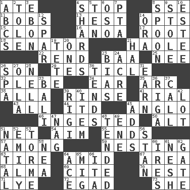 ACROSS 1. Had dinner 4. Obstruct or block passage 8. Compass dir. 11. Moves up and down 13. Command 14. Chooses 15. Hoof sound 16. Small Philippine buffalo 17. Carrot, for example 18. Elected representative 21. White Person, in Hawaii 22. Tear apart 23. Sound made by sheep 25. Born 26. Male child 29. A testis 32. Military trainee 34. Hearing organ 35. Curve 38. Silent film actress Nazimova 39. Remove soap 41. Monetary unit of Yemen 43. 100% 44. It would 45. White American of non-Hispanic descent 46. Consumed 50. Keyboard modifier key 51. Fish or hair follower 54. Direct toward a target or goal 55. Conclusions 57. Amid 59. Nestling 63. Become fatigued 64. Among 67. Length times width 68. _ mater 69. Quote 70. Egg locale 71. Potassium hydroxide 72. Mild oath 73. A female animal or person DOWN 1. Lettered men learn these first 2. Lacquered or enameled metalware 3. Inky black, to poets 4. Pottery fragments 5. Nine, plus one 6. Bear (Spanish) 7. Parent Teacher Association (abbr.) 8. Soup utensil 9. Fur scarf 10. First name in cosmetics 12. Practice fight 14. Mouth or opening 19. False hair 20. Single 21. Actor Linden 23. Prejudice 24. Land measure 26. Health resort 27. Spanish pot 28. 1994 drama film starring Jodie Foster 30. Watches over 31. Merit 33. Indonesian resort city 36. Capital of Latvia 37. Give a ring to 39. Swiss mountan, "Queen of the Mountains" 40. A distinct part 42. Car dealer's back yard 45. Does sums 47. Tired old horse 48. Looked after 49. Compass dir. 51. Brizilian seaport 52. Poet Dickinson 53. Singer Mel 56. Comedian Laurel of Laurel & Hardy 58. Teachers' org. 60. Angers 61. Tender 62. Yard entry 64. Adept person 65. Russian fighter aircraft 66. Call ___ day