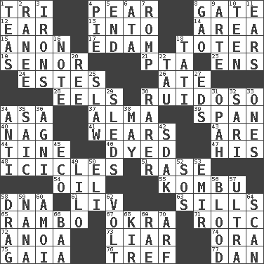 ACROSS 1. Three (prefix) 4. Lightbulb-shaped fruit 8. Yard entry 12. Ewer handle 13. To the inside or interior of 14. Type of rug 15. Soon (poet.) 17. Dutch treat 18. Carrier 19. Sir (Sp.) 21. Parent Teacher Association (abbr.) 23. Followers of ems 24. _____ Park, CO 26. Had dinner 28. Snakelike fish 30. Noisy, rowdy, vocal (Spanish) 34. White ___ sheet 37. _ mater 39. Connect, as a bridge 40. Tired old horse 41. Erodes 43. "We ___ not amused" (Victoria) 44. Prong on a fork 46. Colored 47. Part of HMS, perhaps 48. Winter's stalactites 51. To erase 54. Petroleum 55. Dried seaweed eaten as food 58. Heredity factor (abbr.) 61. 54 in ancient Rome 63. Beverly of Met fame 65. Role for Stallone 67. Gumbo ingredient 71. College mil. group 72. Small Philippine buffalo 73. One who doesn't tell the truth 74. Mouth or opening 75. Greek goddess of the earth (variant) 76. Not kosher 77. Daniel's nick name DOWN 1. Afternoon social gatherings 2. The wife of a rajah (variant) 3. Removes the wrinkles 4. Sliced dessert 5. Conclude 6. "One Day ___ Time" 7. Play 8. E Mali city 9. Johnson of "Laugh-In" 10. Adolescent 11. Hearing organs 16. Brief written record 18. Jacques of French films 20. To riddle 22. The 19th letter of the Greek alphabet 25. Cole _ (cabbage dish) 27. Begley and Asner 29. Bobsleighs 30. More uncommon 31. Brightly colored fish 32. Indian skirt 33. Singles 34. Opposed to 35. Ketch in the Levant 36. Hindu god of fire 38. Fifth month 42. Neighbor of Neb. 45. Environmental prefix 49. _ and Stitch 50. Biblical high priest 52. Mayday 53. Arab leader 56. Vital fluid 57. Extremist 58. To trail on the ground 59. Nanny 60. Mine, in Marseilles 62. Electrical Unit 64. Glance over 66. Sound made by sheep 68. Apertif with cassis 69. Actress Charlotte 70. Sandy's bark