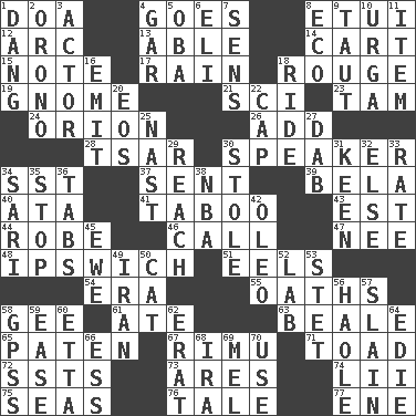 ACROSS 1. ___ good deed 4. Moves 8. Needle case 12. Curve 13. Competent 14. Heavy open wagon 15. Make mention of 17. Precipitation 18. Makeup applied to the cheeks 19. Dwarf 21. _-fi 23. Scottish cap 24. Greek mythologigal hunter 26. Say or write further 28. Russian ruler of old 30. Orator 34. Fast jet (abbr.) 37. Emitted 39. Actor Lugosi 40. "One Day ___ Time" 41. Off limits 43. Eastern Standard Time (abbr.) 44. Loose flowing garment 46. Give a ring to 47. Born 48. NE Massachusetts town 51. Snakelike fish 54. Epoch 55. Expletives 58. Unit of force equal to gravity 61. Had dinner 63. Calif. Air Force Base 65. Eucharist need 67. Tall New Zealand timber tree 71. Frog relative 72. Fast planes 73. Ancient Greek god of war 74. Cards in a Roman deck? 75. Oceans 76. Falsehood 77. Compass dir. DOWN 1. Mild oath, euphamism for damn 2. U. of Maine site 3. Thespian 4. Slender fish 5. Chief or king in Benin or Nigeria 6. Biblical high priest 7. Elected reps. 8. Environmental prefix 9. Pulled tight 10. Capital and largest city of Mongolia 11. A whole individual unit 16. Send forth 18. Travel on or in a vehicle 20. Greek goddess of the dawn 22. Head covering 25. Political cartoonist Thomas 27. Small moist lump or mass 29. Arrive at 30. Fur scarf 31. Peachy ____! 32. Otherwise 33. Assign a rank or rating to 34. Indian skirt 35. Halt 36. Bar bills 38. Basketball assoc. 42. Margarine 45. She-sheep 49. SW Asia republic 50. Feline 52. Experiment locale 53. Proofreading order 56. White Person, in Hawaii 57. Killed 58. Global Positioning Systems (abbr.) 59. Relaxation 60. Singer James 62. Part of Q.E.F. 64. Singer Brickell 66. Double-curved letter 68. Lyricist Gershwin 69. Cartoonist voice _ Blanc 70. Purpose