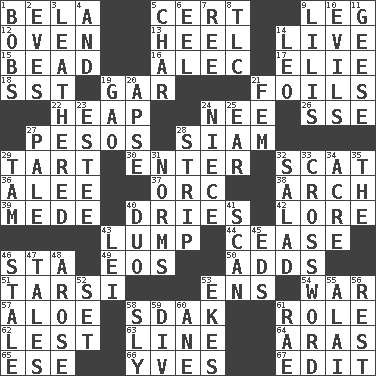 ACROSS 1. Actor Lugosi 5. Sure thing 9. Part of a journey 12. Baking chamber 13. The bottom of a shoe or boot 14. Not recorded 15. Necklace unit 16. Actor Baldwin 17. Writer Wiesel 18. Fast jet (abbr.) 19. Slender fish 21. Fencing necessities 22. Pile 24. Born 26. Compass dir. 27. Mexican monetary units 28. Thailand, formerly 29. Small pie 30. Keyboard key 32. Scram, to a cat 36. Toward shelter 37. The grampus (Milton) 38. Bowlike part 39. Ancient Persian 40. Frees from moisture 42. Old wives' tales, e.g. 43. Mass 44. Stop 46. R.R. building 49. Greek goddess of the dawn 50. Sums up 51. Tarsus (plural) 53. Followers of ems 54. Armed conflict 57. Medicinal plant 58. Neighbor of Neb. 61. Hero or heavy, e.g. 62. For fear that 63. Actor's bit 64. Caspian sea tributary 65. Compass dir. 66. Jacques Cousteau's middle name 67. Prepare for publication DOWN 1. Moves up and down 2. Nights before holidays 3. Tough but pliablecoriaceous 4. Added to 5. Burn to charcoal 6. Snakelike fish 7. To riddle 8. Affectionate concern, for short 9. Ms. Damita and namesakes 10. Vices 11. Honkers 14. Lion 19. E Mali city 20. Domed church section 21. Opposite of masc. 23. First name in cosmetics 24. Sibling's daughter 25. Ewer handle 27. Light colored 28. Remove all contents or possession from 29. Scottish cap 31. Typical models 32. First course 33. What you're doing now 34. 1/640 square mile 35. Definite Article 40. Superhero pair 41. Skim 43. Luau accessory 45. Begley and Asner 46. Having lost freshness 47. Falsehoods 48. Came up 52. Arrange properly for use 53. Supplements with great effort 55. Jai ____ 56. Take ten 58. Mischievous 59. HTML Container Element 60. One (Scot) 61. Actress Charlotte