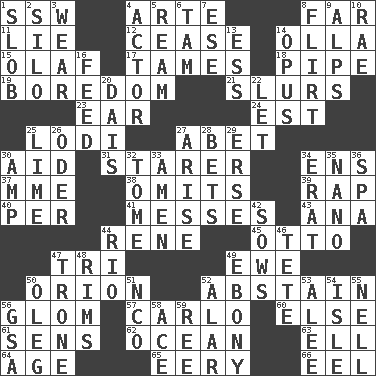 ACROSS 1. Compass dir. 4. Johnson of "Laugh-In" 8. Distant 11. Whopper 12. Stop 14. Water jar 15. Norwegian king 17. Domesticates 18. Corncob 19. Mood resulting from idleness 21. Plays smoothly or legato 23. Ewer handle 24. Eastern Standard Time (abbr.) 25. Farming town in central California 27. Collude with 30. Assist 31. A viewer who gazes fixedly 34. Followers of ems 37. Madame (abbr.) 38. Leaves out 39. Reproach for some lapse or misdeed 40. For each 41. Makes clutter 43. Santa ___, CA 44. French philosopher Descartes 45. "Beetle Bailey" pooch 47. Three (prefix) 49. She-sheep 50. Constellation of myth 52. Choose not to consume 56. Seize upon or latch onto something 57. Monte _, Las Vegas Hotel/Casino 60. Otherwise 61. Elected reps. 62. Sea 63. Pipe bend 64. Mature 65. Suggestive of the supernatural 66. Snakelike fish DOWN 1. Messy guy 2. Grain storage tower 3. Put on (as clothing) 4. Thespian 5. 480, 500 or 516 sheets of paper 6. Scottish cap 7. Compass dir. 8. Seductive woman who exploits men 9. High mountains 10. Actress Charlotte 13. Double-curved letter 14. Musical composition 16. Nourish 20. Raised platform 22. Allow 25. Welles in "The Third Man" 26. Baltic tributary 27. Ascend 28. Wagers 29. Celtic language 30. Electrical Unit 32. Heavy book 33. So be it 34. Part of Q.E.F. 35. Billionth: prefix 36. Health resort 42. Sty mamas 44. _ de Janeiro 46. False hair 47. Heavy duty weighing machine 48. Basketball hoops 49. Dark wood 50. Cassini of fashion 51. Non-commissioned officer (abbr.) 52. Having or resembling wings 53. Toward shelter 54. Capri or Wright 55. 1994 drama film starring Jodie Foster 56. Girls' org. (abbr.) 58. Adept person 59. To separate or throw off