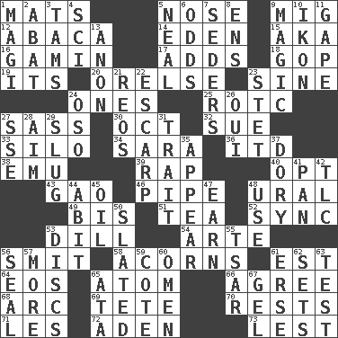 ACROSS 1. Floor coverings 5. Sense of smell 9. Russian fighter aircraft 12. Phillipine bananalike plant 14. Genesis locale 15. Alias (abbr.) 16. Street urchin 17. Does sums 18. Grand Old Party 19. It is 20. Threatening words 23. Trig term 24. Singles 25. College mil. group 27. Backtalk 30. Sep. follower 32. Institute legal proceedings 33. Grain storage tower 34. "Two Mules for Sister ____" 36. It would 38. Australian flightless bird 39. Strike 40. Choose 43. E Mali city 46. Corncob 48. Mountain range 49. Again 51. Beverage made from leaves 52. Synchronize (abbr.) 53. Deli pickle 54. Johnson of "Laugh-In" 56. Stricken, poetically 58. Oak nuts 61. Eastern Standard Time (abbr.) 64. Greek goddess of the dawn 65. Smallest unit of an element 66. Match 68. Curve 69. Wig 70. Musical pauses 71. French article 72. An important port of Yemen 73. For fear that DOWN 1. Wise men 2. Blind as ____ 3. Scottish caps 4. _-fi 5. Be tempered by heat 6. Probability 7. Spring feasts 8. Followers of ems 9. Mysterious quality of enchantment 10. Visual representation of an object 11. Open wide 13. Soon (poet.) 21. Vintage cars 22. Fortification 23. Proofreading order 24. Bear (Spanish) 26. Fr. "Yes" 27. Compass dir. 28. Direct toward a target or goal 29. Strike heavily 31. Distinguishing feature 35. Become visible 37. Dinghy 41. Baking dish 42. Affectionate concern, for short 44. "This won't hurt ____!" 45. Petroleum 47. Merit 48. Purpose 50. Scheduled 53. Flat circles 55. Russian ruler of old 56. Lick closed 57. Greater amount 59. ____ d'Azur (French Riviera) 60. Presage 61. Celtic language 62. Puts into a specified state 63. Trial 65. _ moment's notice (2 wds.) 67. Set
