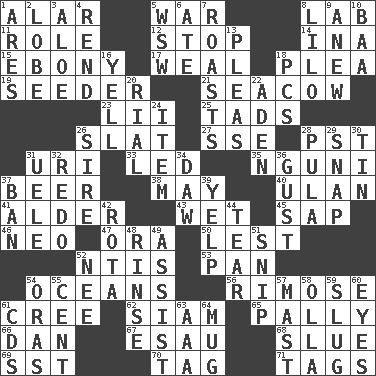 ACROSS 1. Having or resembling wings 5. Armed conflict 8. Experiment locale 11. Hero or heavy, e.g. 12. Halt 14. _ tizzy (2 wds.) 15. Black 17. Welt 18. Entreaty 19. Sowing specialist 21. Manatee 23. Cards in a Roman deck? 25. Bits 26. Narrow board 27. Compass dir. 28. Pacific Standard Time (abbr.) 31. RI univ. 33. Directed 35. Group of southern Bantu languages 37. Fermented drink made from hops 38. Fifth month 40. Uhlan (variant) 41. Tree or shrub in the Birch family 43. Soggy 45. Plant excrement 46. Modern: prefix 47. Mouth or opening 50. For fear that 52. Nuclear Threat Initiatives 53. Baking dish 54. Seas 56. Full of chinks, cracks, or crevices 61. Algonquian 62. Thailand, formerly 65. Friendly 66. Daniel's nick name 67. He sold his birthright 68. Change direction abruptly 69. Fast jet (abbr.) 70. Label 71. Labels DOWN 1. Ancient Greek god of war 2. Ear part 3. Medicinal plant 4. Tear apart 5. Compass dir. 6. Had dinner 7. Ridicules or criticizes harshly 8. _ and Stitch 9. Afresh 10. Sound made by sheep 13. Entreaties 16. Shout 18. Personal Computers (abbr.) 20. Monetary unit of Yemen 22. Arabian gulf 24. A whole individual unit 26. Male parent of an animal 28. Monetary unit of Botswana 29. Fastener 30. Metal container 31. Ubangi River tributary 32. Make new 34. Obsolete 36. Abrupt rush of wind 37. Forbid 39. Sharp bark 42. Roll call or roster of names 44. Rend 48. Wash lightly 49. Help 51. Clip 52. Born 54. Mouths or openings 55. Penny 57. Vertical spar for supporting sails 58. Water jar 59. Strike heavily 60. Sight organs 61. Music discs 63. American Automobile Association (abbr.) 64. Large cup