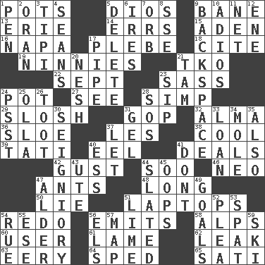 ACROSS 1. Cooking vessels 5. "Vaya con ____" 9. Object of repulsion 13. One of the Great Lakes 14. Blunders 15. An important port of Yemen 16. California wine valley 17. Military trainee 18. Quote 19. Simpletons 21. Ring climax 22. Back-to-school mo. 23. Backtalk 24. Plant holder 27. Perceive with the eye 28. Simple or foolish person 29. Make a splashing sound 31. Grand Old Party 32. _ mater 36. A type of plum 37. French article 38. Calm and collected 39. Jacques of French films 40. Snakelike fish 41. Allots cards 42. Abrupt rush of wind 44. "Barney Miller" actor Jack 46. Modern: prefix 47. Pismires 48. Yearn 50. Untruth 51. Portable computers 54. Redecorate 56. Gives off 58. High mountains 60. One who uses or employs something 61. Unable to walk 62. Path through which fluid escapes 63. Suggestive of the supernatural 64. Hurried 65. Suttee (variant) DOWN 1. Writing instrument 2. NW Algerian seaport 3. Native american tent (variation) 4. Actors Connery and Penn 5. Erase 6. Angers 7. Globe 8. Compass dir. 9. Keyboard key 10. Goodbye (Sp.) 11. Fish or hair follower 12. Compass dir. 17. Corncob 20. Soft 21. Scottish cap 23. Small drink 24. Inconspicuous attention getter 25. Water jar 26. A blast of a horn 28. Mayday 30. Signiory (variant) 31. Set 33. Grant temporary use of 34. Undercover agent 35. In addition 37. Allow 40. Curvy letter 41. Do not 43. Shoshoni 44. Scheduled 45. I made a mistake 47. Tree or shrub in the Birch family 49. Finish lines 51. Welles in "The Third Man" 52. Entreaty 53. Petty quarrel 54. Regret 55. Compass dir. 56. Raised railways 57. Atlas unit 59. What Jean-Claude Killy likes to do