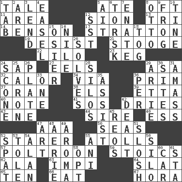 ACROSS 1. Lie 5. Had dinner 8. Often (poetically) 11. Length times width 12. The Jewish people; Israel 13. Three (prefix) 14. Gillaume's butler role 17. Ski resort town in Vermont 19. Stop 21. Moe Howard, for one 22. _ and Stitch 23. Barrel 24. Plant excrement 27. Snakelike fish 29. White ___ sheet 32. Bodily heat indicating an inflammation 34. By way of 36. Demure 37. NW Algerian seaport 38. Raised railways 39. Singer James 40. Observe 41. Distress signal 42. Frees from moisture 43. Compass dir. 44. Father 46. Double-curved letter 47. American Automobile Association (abbr.) 50. Oceans 52. A viewer who gazes fixedly 55. Ringlike coral islands and reefs 57. Characterized by complete cowardliness 59. Unemotional ones 62. Chicken ___ king 63. Body of Kaffir warriors 64. Narrow board 65. "___ Little Indians" 66. Ingest 67. Israeli folk dance DOWN 1. Bar bill 2. "We ___ not amused" (Victoria) 3. Grant temporary use of 4. Artist's stand 5. Small island 6. Cod relative 7. Maternal 8. Von Bismarck 9. Tree-dwelling hopper 10. Prong on a fork 12. Fast jet (abbr.) 15. Flexible twig of a willow tree 16. "Death on the ____" 18. Coat; cloak 20. Finds the solution 24. Biscuitlike quick bread 25. Composer Copland 26. Food holder 28. Grain storage towers 29. Nick name for Arthur 30. Locates 31. Collect or gather 33. Single 35. Aid 36. For each 42. Started a card game 45. Vintage cars 47. Nonscientific branch of learning 48. Nest on high 49. Scent 51. Make a splashing sound 52. Argument over a trivial matter 53. Lacquered or enameled metalware 54. ____ Jay Lerner 55. Cuckoo 56. Grain storage tower 58. Elect 60. 4-wheeled motor vehicle 61. R.R. building