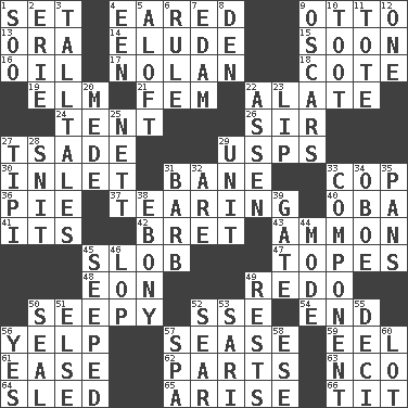 ACROSS 1. Arrange properly for use 4. Having ears or earlike features 9. "Beetle Bailey" pooch 13. Mouth or opening 14. Dodge 15. Within a short period 16. Lubricate 17. Pitcher Ryan 18. ____ d'Azur (French Riviera) 19. Shade tree 21. Opposite of masc. 22. Having winglike extensions 24. Portable shelter 26. Title for a knight 27. Sadhe (variant) 29. United States Postal Service (abbr.) 30. An arm off of a larger body of water 31. Object of repulsion 33. Police officer (slang) 36. Sliced dessert 37. Lacerating 40. Chief or king in Benin or Nigeria 41. It is 42. Cy Young winner Saberhagen 43. ID or VA city 45. Messy guy 47. Drinks excessively 48. Age 49. Make new 50. Not well drained, as in land 52. Compass dir. 54. Conclude 56. Sharp bark 57. Gospel singer Marvin 59. Snakelike fish 61. Comfort 62. Components 63. Non-commissioned officer (abbr.) 64. Downhill vehicle 65. Originate 66. Teat (slang) DOWN 1. "Barney Miller" actor Jack 2. One of the Great Lakes 3. Baron Munchausen's specialties 4. Car or cant ending 5. At or to great height 6. General guideline 7. Dutch treat 8. Lair 9. Motion picture awards 10. A blast of a horn 11. Carry 12. Single 20. Ancient Persian 22. NE Netherlands city 23. Mouth edge 25. Remaining after all deductions 27. Native american tent (variation) 28. In a ____ (agitated or irritated) 29. A single undivided whole 31. Sharp remark 32. "We ___ not amused" (Victoria) 33. Part 34. Mitch Miller's instrument 35. Baking dishes 38. Black 39. Yard entry 44. Method 45. Oozed 46. Trim (branches) 49. Musical pauses 50. Lick closed 51. Otherwise 52. Dry up 53. Indian skirt 55. Tenth: prefix 56. Affirmative reply 57. Health resort 58. Compass dir. 60. Car dealer's back yard