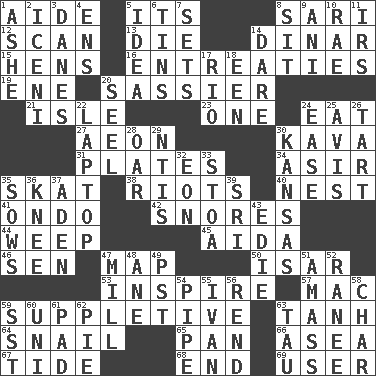 ACROSS 1. Assistant 5. It is 8. Indian skirt 12. Glance over 13. Expire 14. Middle Eastern gold or silver currency 15. Coop moms 16. Pleas 19. Compass dir. 20. More lively and spirited 21. Capri or Wright 23. Single 24. Erode 27. Age 30. Polynesian shrub of the pepper family 31. Food holders 34. SW Saudi Arabia district 35. Three-handed card game 38. Debaucheries 40. A home for chicks 41. Southwest Nigerian state 42. Sounds asleep 44. Shed a tear 45. Opera by Verdi 46. Elected rep. 47. Atlas unit 50. Austrian river, tributary to the Danube 53. Stimulate to action 57. Big _ 59. Supplementary 63. Hyperbolic tangent 64. Slow-paced one 65. Baking dish 66. At sea 67. Periodic rise and fall of the sea level 68. Conclude 69. One who uses or employs something DOWN 1. American tennis player Robert 2. Ancient Celtic tribe of eastern Britain 3. Natives or inhabitants of Denmark 4. Followers of ems 5. It may be bright or harebrained 6. Airtight sealed metal containers 7. Puts into a specified state 8. Be seated 9. Black tropical American cuckoo 10. Actress Charlotte 11. Big collection agency 14. Have the gumption 17. _ de Janeiro 18. Car or cant ending 20. Sew up the eyelids of hawks and falcons 22. Portable computer 24. Relaxation 25. Opinion 26. Small pie 28. Rowing implement 29. Nuclear Threat Initiatives 30. Sunflower state 32. Age 33. Portico 35. Sty mamas 36. Leg joint 37. An important port of Yemen 39. Indian title of respect (Mr.) 43. Singer Brickell 47. Place where flour is made 48. A saturated hydrocarbon 49. Pacific Standard Time (abbr.) 51. Collect or gather 52. Indian princess (variant) 54. Corncob 55. _ the terrible 56. Tear apart 58. Burn to charcoal 59. Fast jet (abbr.) 60. University (slang) 61. Groovy apt. 62. Sliced dessert 63. The 19th letter of the Greek alphabet