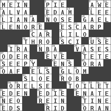ACROSS 1. Chow _ 5. Sliced dessert 8. Deep reverence 11. Inventor's middle name 12. Dutch treat 14. Area sheltered from the wind 15. Woody, climbing, usually tropical plant 17. Olfactory organ 18. Highlander 19. Poe poem 21. Fortification 23. Auto 25. _ and Stitch 26. Through, poetically 27. _-fi 28. Purpose 31. Retirement account (abbr.) 33. Basketball assoc. 35. Flower holders 37. Baltic tributary 38. First lady 40. False hair 41. Oozy 43. Followers of ems 45. Mouth or opening 46. Clumsy lout 47. Raised railways 50. Take by theft 52. A type of plum 53. Director Reiner 54. Threatening words 56. Bathroom plumbing fixture 61. Locale of original sin 62. Singer Brickell 65. Related on the mother's side 66. Modern: prefix 67. It's straight from the horse's mouth 68. Prong on a fork 69. Begley and Asner 70. To free from 71. NW Algerian seaport DOWN 1. Promenade 2. Writer Wiesel 3. "Terrible" tsar 4. Billionth: prefix 5. Writing instrument 6. Wedding promise 7. Artist's stands 8. Having or resembling wings 9. Shed a tear 10. Snakelike fish 13. Of or pertaining to a meson 16. Bowlike part 18. E Mali city 20. Merit 22. 154 in Roman numerals 24. Loose flowing garment 26. Canvas cover 28. One who makes use of a thing 29. Stalk of a moss capsule 30. Compass dir. 31. The main thing one is thinking about 32. Coral collection 34. "___ Maria" 36. Tiny particle 37. Bear (Spanish) 39. Engineer (abbr.) 42. Shout 44. Narrow, elongated depression 48. Failure 49. Sowing specialist 51. Mitch Miller's instrument 52. Elected rep. 54. Wrote a lyric poem 55. Vintage cars 57. To the inside or interior of 58. Den 59. Inactive volcano in Sicily 60. Adolescent 61. Compass dir. 63. One more than two 64. Conclude