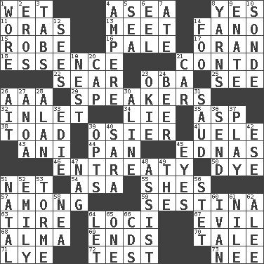 ACROSS 1. Dripping 4. Toward the sea 8. It is so 11. Mouths or openings 13. Rendezvous 14. Papal veil 15. Loose flowing garment 16. Light colored 17. NW Algerian seaport 18. Gist 21. Continued (abbr.) 22. Dry up 23. Chief or king in Benin or Nigeria 25. Observe 26. American Automobile Association (abbr.) 29. Orators 32. An arm off of a larger body of water 34. Falsehood 35. Cleo's killer 38. Frog relative 39. Flexible twig of a willow tree 41. Ubangi River tributary 43. Black tropical American cuckoo 44. Baking dish 45. Ferber et al. 46. Plea 50. Color 51. Fish or hair follower 54. White ___ sheet 55. "______ My Girl" (Turtles hit) 57. Amid 59. French poetic form 63. Hoop that covers a wheel 64. Venues 67. Tending to cause great harm 68. _ mater 69. Conclusions 70. Story 71. Sodium hydroxide 72. Trial 73. Born DOWN 1. Had on 2. Greek god of love 3. Bar bills 4. Electrical Unit 5. Ocean 6. Snakelike fish 7. Had dinner 8. Entertaining tales 9. Related on the mother's side 10. Message 12. Perceives with the eye 14. Egg _ yung 19. Egg locale 20. Head covering 21. Auto 23. Migrant worker of the '30s 24. Fermented drink made from hops 26. Small island 27. Small Philippine buffalo 28. Actor Alda or Thicke 30. Place in a line 31. Saudi Arabian king (1953-1964) 33. Singer Brickell 36. Transmit 37. Romp 39. Chooses 40. "Two Mules for Sister ____" 42. Compass dir. 45. Snake ____ (dice throw) 47. Tired old horse 48. Help 49. Definite Article 51. Brizilian seaport 52. Poet Dickinson 53. Singer Mel 56. Proofreading order 58. Teachers' org. 60. "Terrible" tsar 61. Mediterranean tributary 62. Toward shelter 64. Allow 65. Single 66. Music discs