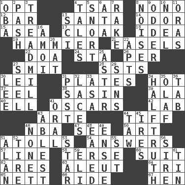 ACROSS 1. Elect 4. Russian ruler of old 8. Words to Nanette 12. Soap unit 13. Before Barbara or Clara 14. Scent 15. Toward the sea 17. Anything that covers or conceals 18. The content of cognition 19. More overdramatic by comparison 21. Artist's stands 23. ___ good deed 24. R.R. building 26. For each 27. Stricken, poetically 28. Fast planes 30. Flowery wreath 31. Food holders 34. Being at a high temperature 37. Snakelike fish 38. Indian antelope 39. Chicken ___ king 40. Pipe bend 41. Motion picture awards 42. Experiment locale 43. Johnson of "Laugh-In" 44. Small quarrel 46. Basketball assoc. 47. Perceive with the eye 50. Nonscientific branch of learning 51. Ringlike coral islands and reefs 54. Replies (to) 57. Actor's bit 58. Laconic 60. Set of matching outer garments 62. Ancient Greek god of war 63. Eskimo relative 64. Three (prefix) 65. Remaining after all deductions 66. Travel on or in a vehicle 67. Layer DOWN 1. Chief or king in Benin or Nigeria 2. Romantic infatuation 3. Excercise machine 4. Stories 5. Derisive sound 6. "One Day ___ Time" 7. Libertine 8. Annoying sounds 9. More peculiar 10. Christmas carol 11. Mouths or openings 13. _-fi 16. Mine, in Marseilles 20. Floor protector 22. Flats, for short 25. Moving about 27. Stitch closed the eyes of (a falcon) 29. Elected reps. 30. Area sheltered from the wind 31. Inconspicuous attention getter 32. Shoestrings 33. White ___ sheet 34. Not exactly gospel 35. Norwegian king 36. Bar bill 41. Taken by mouth 43. Most capable 44. The 23rd letter of the Hebrew alphabet 45. Angers 46. Music written for nine 48. Having ears or earlike features 49. Follow as a consequence or result 51. Actor Alda or Thicke 52. Hoop that covers a wheel 53. Play the lead 55. Arrange properly for use 56. Father 59. Connecticut Ivy Leaguer 61. Shallow baking pan