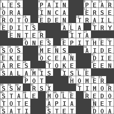 ACROSS 1. French article 4. Ache 8. Lightbulb-shaped fruit 12. Mouth or opening 13. South American Indian 14. Celtic language 15. Printing process, for short 17. Locale of original sin 18. Lag or linger behind 19. Proofreads 21. Chicken ___ king 23. Attempt 24. Keyboard key 26. Call ___ day 28. Washington bills 30. Curse 34. Distress signal 37. Not women's 39. Assistant 40. Make supply last 41. Sea 43. Expire 44. Ancient Greek god of war 46. Puff or smoke 47. Car or cant ending 48. Deli grouping 51. Small island 54. Plant holder 55. Home run 58. Compass dir. 61. Acura sports coupe 63. The easternmost of the Lesser Sundas 65. Having lost freshness 67. Undercover agent 71. Do over again 72. Carry 73. Capital of Western Samoa 74. Fish or hair follower 75. Suttee (variant) 76. Proofreading order 77. ___ good deed DOWN 1. Old wives' tales, e.g. 2. Eat (away) 3. Smooth fabric 4. Sliced dessert 5. Added to 6. Frozen water 7. Nanny 8. For each 9. Part of Q.E.F. 10. SW Saudi Arabia district 11. Have confidence or faith in 16. Von Bismarck 18. Jacques of French films 20. Elected rep. 22. Mouth edge 25. San ____ (Riviera town) 27. _ moment's notice (2 wds.) 29. Religious groups 30. 1973 Nobel Price Winner (Physics) Leo 31. Flintstone garb 32. Singer Brickell 33. Adolescent 34. Oceans 35. Gumbo ingredient 36. Sew up the eyelids of hawks and falcons 38. Modern: prefix 42. Tender 45. Plant excrement 49. Greater amount 50. It is 52. Car dealer's back yard 53. Arab leader 56. Make improvements or corrections to 57. Cowboy competition 58. Fast planes 59. Portico 60. Electrical Unit 62. Dec. holiday 64. Roll call or roster of names 66. Flowery wreath 68. Choose 69. Untruth 70. Consume