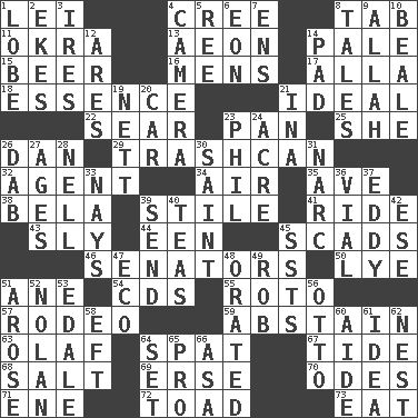 ACROSS 1. Luau accessory 4. Algonquian 8. Bar bill 11. Gumbo ingredient 13. Age 14. Light colored 15. Fermented drink made from hops 16. Not women's 17. Silent film actress Nazimova 18. Center 21. Perfect 22. Shrivel 23. Baking dish 25. A female animal or person 26. One of the 12 tribes of Israel 29. File 13 32. Representative 34. Atmosphere 35. "___ Maria" 38. Actor Lugosi 39. Vertical member of a panel or frame 41. Travel on or in a vehicle 43. Mischievous 44. Car or cant ending 45. Heaps 46. Elected representatives 50. Sodium hydroxide 51. One (Scot) 54. Music discs 55. Printing process, for short 57. Cowboy competition 59. Refrain by choice 63. Norwegian king 64. Argument over a trivial matter 67. Event that recurs at intervals 68. Table seasoning 69. Celtic language 70. Lyric poems 71. Compass dir. 72. Frog relative 73. Ingest DOWN 1. Ear part 2. Makes supply last 3. Angers 4. Device for capturing images 5. To sift 6. Age 7. Followers of ems 8. Stories 9. Assad's deity 10. Calif. Air Force Base 12. Ancient Greek god of war 14. Groovy apt. 19. Remaining after all deductions 20. Automobile 21. _ tizzy (2 wds.) 23. Silvers or Donahue 24. Measure of real estate 26. Apply (a substance) by light strokes 27. Grows older 28. 1994 drama film starring Jodie Foster 30. Inhabitant of Heaven 31. Drug cop 33. Negative votes 36. Small bottle 37. Whirlpool 39. Post 40. Beverages made from leaves 42. Compass dir. 45. Fast planes 47. Environmental prefix 48. Declaimed 49. Director Reiner 51. Came up 52. Pitcher Ryan 53. Peak District village in England 56. "Beetle Bailey" pooch 58. Lizard (obsolete) 60. Assistant 61. The main thing one is thinking about 62. A home for chicks 64. Arrange properly for use 65. Adept person 66. White ___ sheet