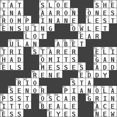 ACROSS 1. Make lace 4. A type of plum 8. A female animal or person 11. _ tizzy (2 wds.) 12. Composer Copland 14. Washington bills 15. Frolic 17. Silly 18. For fear that 19. Following as a consequence or result 21. A small or young owl 23. Car dealer's back yard 24. Ewer handle 25. ____ Bator 27. Collude with 30. Three (prefix) 31. A viewer who gazes fixedly 34. Connecticut Ivy Leaguer 37. Possessed 38. Leaves out 39. Separate the seeds from cotton 40. Raised railways 41. Makes clutter 43. Find the sum of 44. French philosopher Descartes 45. Whirlpool 47. River (Sp.) 49. R.R. building 50. Sir (Sp.) 52. Player piano 56. Inconspicuous attention getter 57. Motion picture award 60. Amused look 61. "Tell ____ the Marines!" 62. Calif. Air Force Base 63. Adept person 64. Double-curved letter 65. Sight organs 66. ___ Haven, CT DOWN 1. Become fatigued 2. Soon (poet.) 3. Scottish caps 4. Inhabitant of Heaven 5. Austrian-born American filmmaker Fritz 6. Mouth or opening 7. A really long time 8. Contemptuous expression 9. Command 10. Eastern Standard Time (abbr.) 13. Modern: prefix 14. Water jar 16. Monetary unit of Botswana 20. Charged particles 22. Soggy 25. Mountain range 26. Flaplike coverings 27. Ascend 28. Wagers 29. Celtic language 30. Definite Article 32. Heavy book 33. So be it 34. Mild oath 35. Kenny Rogers chart-topper in '80 36. Working for oneself (abbr.) 42. Bristle 44. Friend of Pooh 46. Mild oath, euphamism for damn 47. Musical pauses 48. To the inside or interior of 49. Titles for men of rank and authority 50. Fast planes 51. Director Reiner 52. Light colored 53. Northwest Algerian city 54. Louse (plural) 55. Afresh 56. Sliced dessert 58. Observe 59. Island