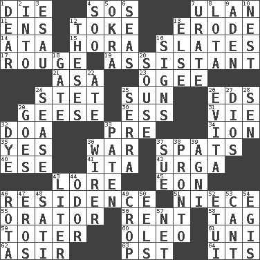 ACROSS 1. Expire 4. Distress signal 7. ____ Bator, Mongolia 11. Followers of ems 12. Casino tip 13. Eat (away) 14. "One Day ___ Time" 15. Israeli folk dance 16. Chalkboards 17. Makeup applied to the cheeks 19. Helper 21. White ___ sheet 23. Double curve, resembling the letter S 24. Proofreading order 25. Player for Phoenix 26. Begley and Asner 29. Honkers 30. Curvy letter 31. Compete 32. ___ good deed 33. Before (prefix) 34. Electrically charged atom 35. Consenting reply 36. Armed conflict 37. Arguments over trivial matters 40. Compass dir. 41. Call ___ day 42. Capital and largest city of Mongolia 43. Old wives' tales, e.g. 45. Age 46. Dwelling 51. Sibling's daughter 55. Speaker 56. Monthly bill 58. Label 59. Carrier 60. Margarine 61. University (slang) 62. SW Saudi Arabia district 63. Pacific Standard Time (abbr.) 64. ___ a Wonderful Life DOWN 1. Letter starter 2. To the inside or interior of 3. Son of Isaac 4. "Barney Miller" actor Jack 5. Gumbo ingredient 6. Oceans 7. A salt of uric acid 8. Globular water bottle used in Asia 9. An important port of Yemen 10. Egg locale 12. College papers 13. Otherwise 16. Public displays of written messages 18. Yard entry 20. Boozer 22. Had dinner 24. Gospel singer Marvin 25. Spanish missionary in California 26. Webber/Rice musical 27. "Vaya con ____" 28. Elected rep. 29. Moves 32. Color 33. Eucharist need 36. One who wires 37. Institute legal proceedings 38. Right away 39. Hindu god of fire 43. 61 cubic inches 44. Aroma 46. Round or rotation of duties 47. Greek god of love 48. Suttee (variant) 49. Riding implement 50. Snakelike fish 52. Needle case 53. Patter 54. Armor plate that protects the chest 57. Fish or hair follower