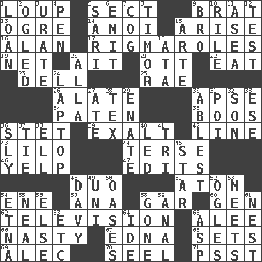 ACROSS 1. Central Nebraska county 5. Religious group 9. Naughty child 13. Legendary monster 14. Mine, in Marseilles 15. Originate 16. Actor Alda or Thicke 17. Complicated, petty procedures 19. Fish or hair follower 20. Small island 21. Baseball player Mel 22. Consume 23. Small valley 25. Actress Charlotte 26. Having winglike extensions 30. Domed church section 34. Eucharist need 35. Expressions of contempt or scorn 36. Proofreading order 39. Honor 42. Actor's bit 43. _ and Stitch 44. Laconic 46. Sharp bark 47. Proofreads 48. Superhero pair 51. Tiny particle 54. Compass dir. 57. Santa ___, CA 58. Slender fish 60. Commissioned mil. rank 62. Household entertainment appliance 65. Toward shelter 66. Difficult 67. Pulitzer Prize-winning author Ferber 68. Arranges properly for use 69. Actor Baldwin 70. Sew up the eyelids of hawks and falcons 71. Inconspicuous attention getter DOWN 1. Grant temporary use of 2. Stared at amorously 3. A salt of uric acid 4. Writing instrument 5. Indian skirt 6. Give off 7. Gear tooth 8. Southeast Indonesia island 9. Sis' sibling 10. Cause heat under the collar 11. Toward the sea 12. Trial 15. Johnson of "Laugh-In" 18. "One Day ___ Time" 20. Silent film actress Nazimova 24. Portable computer 27. Had dinner 28. John Ritter's dad 29. Related on the mother's side 30. Most capable 31. Luau course 32. Boy, to dad 33. Compass dir. 36. Mischievous 37. Make a knot 38. Pipe bend 40. Directed 41. Three (prefix) 45. Play the lead 48. American folk hero Crockett 49. University (slang) 50. Fertile tracts in a desert 52. Stares 53. Confronts 54. Inactive volcano in Sicily 55. Be tempered by heat 56. Otherwise 58. Went 59. Of or related to the anus 61. Egg locale 63. And so on (abbr.) 64. Binary compound 65. Viper