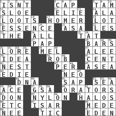 ACROSS 1. Is not 5. Head covering 8. Scottish cap 11. A type of plum 12. Writer Wiesel 14. In the manner of 15. Plunders 17. Simpsons dad 18. Car dealer's back yard 19. Gist 21. White ___ sheet 22. French article 23. Definite Article 24. Everything 25. Make lace 27. Infant food 28. Soap units 31. Old wives' tales, e.g. 35. Cartoonist voice _ Blanc 37. Toward shelter 38. The main thing one is thinking about 39. Director Reiner 41. Penny 42. Egg locale 43. For each 45. At sea 46. Singer Brickell 47. Modern: prefix 49. Heredity factor (abbr.) 51. Plant excrement 52. Ocean 55. Adept person 57. Girls' org. (abbr.) 60. Speakers 62. Spanish title 63. High-strength synthetic material 65. Rings 66. And so on (abbr.) 67. Austrian river, tributary to the Danube 68. Ancient Persian 69. Born 70. Nervous spasm 71. Locale of original sin DOWN 1. Small island 2. Agitate, as a liquid 3. Trap for birds or small mammals 4. False hair 5. Corporate head (abbr.) 6. _ mater 7. Sliced desserts 8. Baron Munchausen's specialties 9. _ vera 10. Floor coverings 13. Part of Q.E.F. 16. Fastener 17. Assistant 20. Burrowing marine mollusk 26. Phillipine bananalike plant 29. French philosopher Descartes 30. Bristle 31. Actor's bit 32. Wrote a lyric poem 33. Home 34. Consumed 36. Trim (branches) 40. Gillaume's butler role 44. Rump 48. Brightly colored fish 50. Hindu god of fire 52. Having a sole or soles 53. Wear away 54. NE Netherlands city 55. An important port of Yemen 56. ____ d'Azur (French Riviera) 58. System (abbr.) 59. Mountain range southwest of Kyrgyzstan 61. Docile 64. The grampus (Milton)