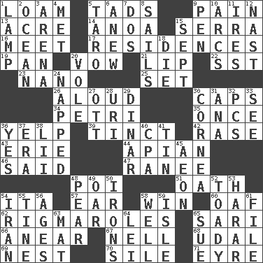 ACROSS 1. Rich soil 5. Small amounts or degrees 9. Ache 13. Land measure 14. Small Philippine buffalo 15. Father Junipero _ 16. Rendezvous 17. Homes 19. Baking dish 20. Promise 21. Mouth edge 22. Fast jet (abbr.) 23. Billionth: prefix 25. Put into a specified state 26. Verbally 30. Balmoral and tarboosh 34. _ dish (used to culture cells) 35. At one time in the past 36. Sharp bark 39. A color or tint 42. Raze (variant) 43. One of the Great Lakes 44. Bee-related 46. Stated 47. The wife of a rajah (variant) 48. Luau course 51. Pledge 54. Call ___ day 57. Ewer handle 58. Victory 60. Clumsy lout 62. Complicated, petty procedures 65. Indian skirt 66. Approach 67. 1994 drama film starring Jodie Foster 68. Freehold land 69. Egg locale 70. Filth; sediment 71. Jane of fiction DOWN 1. Desk light 2. Sea 3. Sports stadium 4. Was introduced to 5. Pacific island yam 6. Afresh 7. Two (Sp.) 8. Travel by water 9. Animal enclosure 10. Curves 11. Angers 12. Political cartoonist Thomas 15. Back-to-school mo. 18. Pass on 20. Grand slam 24. Slept 27. Baseball player Mel 28. RI univ. 29. Middle Eastern gold or silver currency 30. Pupil covering 31. Santa ___, CA 32. Personal Computers (abbr.) 33. Perceive with the eye 36. Affirmative reply 37. Period 38. Cards in a Roman deck? 40. Tax preparer (abbr.) 41. Shallow baking pan 45. Age 48. Lightbulb-shaped fruit 49. Rowing implement 50. Metal shackles 52. Sycophant 53. Ethiopian city, capital of Harari 54. SW Asia republic 55. Prong on a fork 56. Eons 58. Not ill 59. Small island 61. Do some clerical work 63. Floor protector 64. Luau accessory 65. Take to court