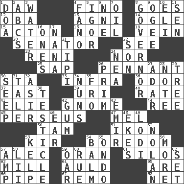 ACROSS 1. Simpleton 4. Fine (Spanish) 8. Travels 12. Chief or king in Benin or Nigeria 13. Hindu god of fire 14. Stare 15. 13-14th century defensive garment 18. Christmas carol 19. Distinctive style or manner 20. Legislator 22. Perceive with the eye 23. Painter Guido (1575-1642) 24. And not 25. Plant excrement 26. Pre-World Series prize 30. R.R. building 33. Kind of red light 36. Aroma 37. 90 degrees 39. RI univ. 40. Assign a rank or rating to 41. Writer Wiesel 42. Dwarf 44. To sift 45. Son of Zeus who helped slay Medusa 47. Cartoonist voice _ Blanc 50. Scottish cap 51. Picture 53. Apertif with cassis 54. Mood resulting from idleness 57. Actor Baldwin 59. NW Algerian seaport 61. Grain storage towers 63. Place where flour is made 64. Old (Scot.) 65. "We ___ not amused" (Victoria) 66. Corncob 67. San ____ (Riviera town) 68. Fish or hair follower DOWN 1. ___ good deed 2. Lettered men learn these first 3. Wetness 4. Papal veil 5. Russian composer Stravinsky 6. Compass dir. 7. Lubricate 8. Head of state? 9. Double curve, resembling the letter S 10. Connecticut Ivy Leaguer 11. Elected rep. 16. Singles 17. Nanny 21. Native american tent (variation) 22. Boy, to dad 24. Teachers' org. 26. Demure 27. The sixth month of the Jewish calendar 28. Make mention of 29. Relationship diagram 30. Ooze 31. Falsehood 32. SW Saudi Arabia district 34. Religious women 35. From 38. A testis 42. Chewing product 43. Independent ruler or chieftain 46. Hearing organ 48. Supplements with great effort 49. Farming town in central California 52. Pitcher Ryan 53. Seaweed 54. Lip ointment 55. Southwest Nigerian state 56. Greater amount 57. Electrical Unit 58. Cards in a Roman deck? 59. Rowing implement 60. Regret 62. Arrange properly for use