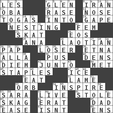 ACROSS 1. French article 4. Small, secluded valley 8. SW Asia republic 12. Chief or king in Benin or Nigeria 13. Raze (variant) 14. Characteristic smell of wine 15. Ancient Roman robes 18. To the inside or interior of 19. Yawn 20. Inhabiting a nest 22. Opposite of masc. 23. Three-handed card game 24. Greek goddess of the dawn 25. Santa ___, CA 26. Of or relating to Laos or its people 30. Infant food 33. Failure 36. Inactive volcano in Sicily 37. Silent film actress Nazimova 39. Ichor 40. Habitations of wild animals 41. South Vietnam president (1954) 42. Secret group 44. Was introduced to 45. Paper fasteners 47. Frozen water 50. Ingest 51. Unable to walk 53. Globe 54. Heighten or intensify 57. "Two Mules for Sister ____" 59. Not recorded 61. Took without asking 63. Heroin 64. Part of Q.E.F. 65. June honoree 66. Relaxation 67. Is not 68. Followers of ems DOWN 1. Car dealer's back yard 2. Inky black, to poets 3. Gurus 4. Smile widely 5. Austrian-born American filmmaker Fritz 6. Eastern Standard Time (abbr.) 7. Modern: prefix 8. Consumed 9. Wander aimlessly 10. Viper 11. Born 16. "____ silly question..." 17. Comedian Laurel of Laurel & Hardy 21. Slanted text style (abbr.) 22. Egg _ yung 24. Hearing organ 26. For fear that 27. A whole individual unit 28. Queen of England 1702-14 29. Political cartoonist Thomas 30. Writing tablets 31. Set down 32. Entreaty 34. Musical composition 35. Player for Phoenix 38. Electrical Measurement 42. Passenger plane 43. Lubricates 46. Experiment locale 48. Balmoral and tarboosh 49. Give off 52. Eat (away) 53. Mouths or openings 54. "Terrible" tsar 55. Remaining after all deductions 56. Liveliness 57. Compass dir. 58. Alias (abbr.) 59. Luau accessory 60. Big collection agency 62. Begley and Asner