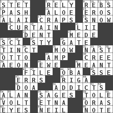 ACROSS 1. Proofreading order 5. Depend 9. Confederate soldiers (slang) 13. Romantic infatuation 14. _ vera 15. Greek god of love 16. Jai ____ 17. Dice game 18. Overwhelm 19. Window treatment 21. Cards in a Roman deck? 22. Gouge 23. Ancient Persian 24. _-fi 27. Filthy place 28. Yard entry 29. Tinged 31. Cut the grass 32. Political cartoonist Thomas 36. "Beetle Bailey" pooch 37. Electrical Unit 38. Algonquian 39. Period of immesurable duration 40. She-sheep 41. Intended 42. Do some clerical work 44. Chief or king in Benin or Nigeria 46. Compass dir. 47. Blunders 48. Capital of Latvia 50. ___ good deed 51. Inveterate users 54. ____ Jay Lerner 56. Gurus 58. Lacquered or enameled metalware 60. Electrical Unit 61. Inactive volcano in Sicily 62. Mouths or openings 63. Sight organs 64. Famous astronaut Armstrong 65. Make mention of DOWN 1. Health resort 2. Baby powder 3. Son of Isaac 4. One of three equal parts 5. Noteworthy scarcity 6. Style 7. Chop off 8. Consenting reply 9. Home 10. Bert's buddy 11. Oct. 31 cry 12. Compass dir. 17. Patter 20. Trial 21. Allow 23. Informal term for the mouth 24. Portico 25. Quote 26. To the inside or interior of 28. Republican Party 30. Meets 31. Madame (abbr.) 33. Ancient river in northeast Turkey 34. Elected reps. 35. Wig 37. Deep reverence 40. Raised railways 41. Wise men 43. Lyricist Gershwin 44. Severe or trying experience 45. Auction offers 47. Peak District village in England 49. NE Massachussets city 51. Hindu god of fire 52. "Corrida" creature 53. Narrow board 54. "___ Maria" 55. Myrna of the movies 56. Elected rep. 57. Had dinner 59. Compass dir.