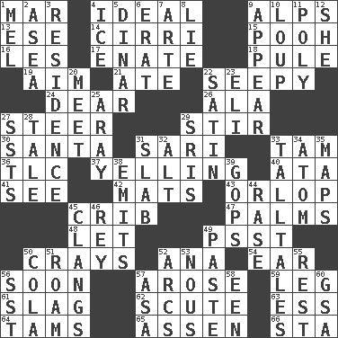 ACROSS 1. Impair 4. Standard of perfection 9. High mountains 13. Compass dir. 14. High-altitude cloud 15. "Silly old bear" 16. French article 17. Related on the mother's side 18. Whine 19. Direct toward a target or goal 21. Had dinner 22. Oozy 24. Letter starter 26. According to 27. Bull 29. Disorderly outburst 30. Before Barbara or Clara 31. Indian skirt 33. Scottish cap 36. Affectionate concern, for short 37. Crying or shouting loudly 40. "One Day ___ Time" 41. Observe 42. Floor coverings 43. Fourth or lowest deck 45. Baby bed with high sides 47. Insides of hands 48. Allow 49. Inconspicuous attention getter 50. Trading vessels 52. Santa ___, CA 54. Hearing organ 56. Within a short period 57. Came up 59. Part of a journey 61. Volcanic refuse 62. Snake scale 63. Double-curved letter 64. Scottish caps 65. NE Netherlands city 66. R.R. building DOWN 1. Cartoonist voice _ Blanc 2. Toward the sea 3. Home 4. Frozen water 5. Middle Eastern gold or silver currency 6. Part of Q.E.F. 7. Johnson of "Laugh-In" 8. Untruth 9. Become visible 10. Central Nebraska county 11. More than one (prefix) 12. A female animal or person 20. Confront 22. Smooth fabric 23. Biblical high priest 25. Like ___ of sunshine 27. Fast planes 28. Falsehood 29. Indian titles of respect 31. Broad, flat, thick piece 32. The first octave above the treble staff 33. Baron Munchausen's specialties 34. Smallest unit of an element 35. Atlas contents 38. Sends forth 39. Republicans 44. Raze (variant) 45. Rigngs loudly 46. Marina Del _, California 49. Thick mixture 50. Root beer relative 51. Wander aimlessly 52. Curves 53. Horse sense 55. State of inaction 56. Fast jet (abbr.) 57. White ___ sheet 58. Car or cant ending 60. Girls' org. (abbr.)