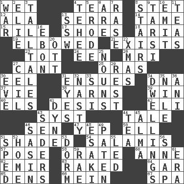 ACROSS 1. Soggy 4. Lacerate 8. Proofreading order 12. In the manner of 13. Father Junipero _ 14. Docile 15. Cause heat under the collar 17. Imelda's hoard 18. Roberta Peters solo 19. Turned at an angle; bent 21. Is 23. Small child 24. Car or cant ending 26. Medical imaging device (abbr.) 27. Patter 28. Mouths or openings 30. Snakelike fish 31. Follows as a consequence or result 34. Heredity factor (abbr.) 37. Compete 38. Tall tales 39. Victory 40. Raised railways 41. Stop 42. Connecticut Ivy Leaguer 43. System (abbr.) 44. Falsehood 46. Elected rep. 47. Slangy assent 50. Pipe bend 51. Cast a shadow over 54. Deli grouping 57. Introduce or present, as a question 58. Declaim 60. Queen of England 1702-14 62. Independent ruler or chieftain 63. Moved through 64. Slender fish 65. Habitations of wild animals 66. Count _ (2 wds.) 67. Health resort DOWN 1. Armed conflict 2. Writer Wiesel 3. Baron Munchausen's specialties 4. Giggle 5. Eat (away) 6. "We ___ not amused" (Victoria) 7. To erase 8. Flight of steps 9. Tarsus (plural) 10. Send forth 11. Afternoon social gatherings 13. Compass dir. 16. Inky black, to poets 20. Baseball player Mel 22. Dec. holiday 25. Parts of speech 27. To provide with a ceiling 29. Remainder 30. First lady 31. Sight organs 32. Offensive 33. Indian title of respect (Mr.) 34. Residences 35. "Death on the ____" 36. Black tropical American cuckoo 41. Unit of force 43. Spring feasts 44. Afternoon social gathering 45. _ mater 46. Indian antelope 48. 1973 Nobel Price Winner (Physics) Leo 49. Eucharist need 51. Broke a traffic law 52. Dwelling 53. Dormintory (informal) 55. Directed 56. Fastener 59. Actress Charlotte 61. Period