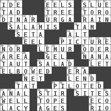ACROSS 1. Binary compound 4. Snakelike fish 8. Turn sharply 12. Bit 13. Family _ (genealogy) 14. "Corrida" creature 15. Middle Eastern gold or silver currency 18. Capital and largest city of Mongolia 19. Precipitation 20. Deli grouping 22. Scottish cap 23. Bristle 24. The first octave above the treble staff 25. Snakelike fish 26. Photo 30. Or not 33. Arboreal primate 36. River in Europe 37. Type of rug 39. Set 40. Grandmother 41. Strained 42. Vegetable dish 44. Allow 45. Shoved, as through a crowd 47. Epoch 50. Fish or hair follower 51. Grant temporary use of 53. Make lace 54. Manned the helm 57. Of or related to the anus 59. Commotion 61. Settings 63. Not ill 64. Drink excessively 65. Environmental prefix 66. Made of lace 67. Ripens 68. _ de Janeiro DOWN 1. It would 2. Raised platform 3. Ferber et al. 4. Needle holder 5. Blunders 6. Part of a journey 7. Ocean 8. Ski resort town in Vermont 9. Rich soil 10. RI univ. 11. Period of immesurable duration 16. Toward shelter 17. Pace 21. Promenade 22. Affectionate concern, for short 24. Wind 26. Monetary unit of Botswana 27. Allodial 28. French philosopher Descartes 29. Part of Q.E.F. 30. Nathan's nickname 31. Of the mouth 32. Reuben's nickname 34. Mild oath 35. Cartoonist voice _ Blanc 38. Lacking a tonal center or key 42. Put into a specified state 43. Small valley 46. Soggy 48. Vintage cars 49. Opposed to 52. Prevent from occurring 53. Baby powder 54. Corncob 55. Angers 56. Tenth: prefix 57. Leather borer 58. Teachers' org. 59. R.R. building 60. Coat; cloak 62. "Barney Miller" actor Jack