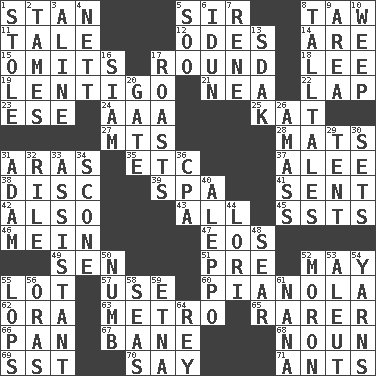 ACROSS 1. Comedian Laurel of Laurel & Hardy 5. Title for a knight 8. The 23rd letter of the Hebrew alphabet 11. Lie 12. Lyric poems 14. "We ___ not amused" (Victoria) 15. Leaves out 17. Unit of ammunition 18. Area sheltered from the wind 19. Small, flat, pigmented spot on the skin 21. Teachers' org. 22. Infant locale 23. Compass dir. 24. Auto club (abbr.) 25. Krazy ___ of comics 27. Mountains (abbr.) 28. Floor protectors 31. Caspian sea tributary 35. And so on (abbr.) 37. Toward shelter 38. Plate 39. Health resort 41. Emitted 42. In addition 43. 100% 45. Fast planes 46. Chow _ 47. Greek goddess of the dawn 49. Elected rep. 51. Before (prefix) 52. Can I? 55. Car dealer's back yard 57. Purpose 60. Player piano 62. Mouth or opening 63. Paris' subway 65. More uncommon 66. Baking dish 67. Object of repulsion 68. Part of speech 69. Fast jet (abbr.) 70. Declare 71. Pismires DOWN 1. Fur scarf 2. Corrects by punishment or discipline 3. Place in a line 4. Remaining after all deductions 5. "Barney Miller" actor Jack 6. Goddess of spring and wife of Bragi 7. French philosopher Descartes 8. Baron Munchausen's specialties 9. Length times width 10. Shed a tear 13. Neighbor of Neb. 16. Thailand, formerly 17. Ridicules or criticizes harshly 20. Yard entry 26. Collect or gather 29. Portable shelter 30. Puts into a specified state 31. First man 32. Cause heat under the collar 33. Aide 34. Biscuitlike quick bread 36. Tax preparer (abbr.) 40. City in Syria 44. Australian parrot (variant) 48. Singe 50. Unfeeling 52. Person of subnormal intelligence 53. Native American of Southwest Alaska 54. Entertaining tales 55. Chops off 56. Mouths or openings 58. Oceans 59. Inactive volcano in Sicily 61. Grandmother 64. Marina Del _, California