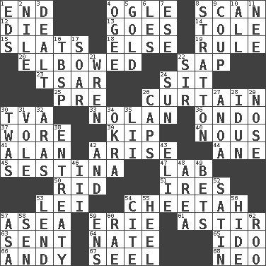 ACROSS 1. Conclusion 4. Stare 8. Examine hastily 12. Pass on 13. Leaves 14. Lacquered or enameled metalware 15. Narrow boards 18. Otherwise 19. Governing power 20. Shoved, as through a crowd 22. Plant excrement 23. Russian ruler of old 24. Be seated 25. Before (prefix) 26. Window treatment 30. Federal power corp. 33. Pitcher Ryan 36. Southwest Nigerian state 37. Had on 39. Sleep 40. Common sense 41. ____ Jay Lerner 42. Ascend 44. One (Scot) 45. French poetic form 47. Experiment locale 50. To free from 51. Angers 53. Luau accessory 54. Leopard's kin 57. At sea 59. One of the Great Lakes 61. Moving about 63. Posted 64. Nathan's nickname 65. Wedding promise 66. Actor Griffith 67. Sew up the eyelids of hawks and falcons 68. Modern: prefix DOWN 1. Begley and Asner 2. "Death on the ____" 3. Started a card game 4. Double curve, resembling the letter S 5. Aureate 6. French article 7. Compass dir. 8. Ski resort town in Vermont 9. Overturn; upset 10. 100% 11. Born 16. Cook's measure (abbr.) 17. Fly high 21. Songbird 22. Title for a knight 24. Player for Phoenix 26. Balmoral and tarboosh 27. Small Philippine buffalo 28. Goddess of spring and wife of Bragi 29. Olfactory organ 30. It was, poetically 31. Grand slam 32. Ancient river in northeast Turkey 34. Gumbo ingredient 35. Cards in a Roman deck? 38. Plea 42. Added to 43. Writer Wiesel 46. One more than two 48. Length times width 49. Antes 52. Smooth fabric 53. Grant temporary use of 54. Quote 55. The bottom of a shoe or boot 56. Flintstone garb 57. White ___ sheet 58. Elected rep. 59. Followers of ems 60. Actress Charlotte 62. Friend of Pooh