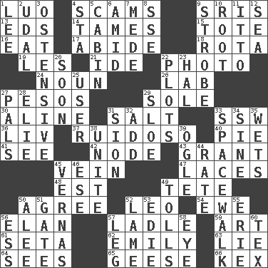 ACROSS 1. Nilotic language 4. Fraudulent business schemes 9. Indian titles of respect 13. Begley and Asner 14. Corrects by punishment or discipline 15. Carryall 16. Erode 17. Remain 18. Round or rotation of duties 19. French article 21. Binary compound 22. Picture 24. Part of speech 26. Experiment locale 27. Mexican monetary units 29. Not divided or shared with others 30. Place in a line 31. Table seasoning 33. Compass dir. 36. 54 in ancient Rome 37. Noisy, rowdy, vocal (Spanish) 40. Sliced dessert 41. Observe 42. Connecting point 43. Monetary aid 45. Distinctive style or manner 47. Shoestrings 48. Eastern Standard Time (abbr.) 49. False hair 50. Match 52. Lion 54. She-sheep 56. Enthusiasm 57. Dipping utensil 59. Tate display 61. Bristle 62. Poet Dickinson 63. Falsehood 64. Observes 65. Honkers 66. Dry husk or covering DOWN 1. Area sheltered from the wind 2. Allodial 3. Clearly or manifestly demonstrative 4. R.R. building 5. Apartment or room in a ship 6. Among 7. Ancient Persian 8. Compass dir. 9. Disco prop 10. Carrot, for example 11. "Tell ____ the Marines!" 12. Ocean 20. Within a short period 22. Secret plans 23. Actor Linden 25. One who makes use of a thing 27. Friends 28. Writer Wiesel 29. _ gin 31. The Jewish people; Israel 32. Say or write further 33. High altitude stroll 34. Trig term 35. Moistens 38. Join together 39. Stare 44. Assign a rank or rating to 45. Actresses Bloom and Felton 46. Compass dir. 49. For Whom the Bell _____ 50. Toward shelter 51. Yard entry 52. Unable to walk 53. Singer Brickell 55. One of the Great Lakes 56. Double-curved letter 57. Part of a journey 58. Sight organ 60. John Ritter's dad