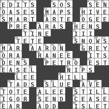 ACROSS 1. Proofreads 6. Mayday 9. Elected rep. 12. Fertile tracts in a desert 13. Atlas contents 14. Hub of activity 15. Don Adams' spy role 16. Johnson of "Laugh-In" 17. Double curve, resembling the letter S 18. Before (prefix) 19. Ancient river in northeast Turkey 20. Coop moms 21. Prong on a fork 23. One more than two 24. Wig 25. Overwhelms 28. Spoil 30. Composer Copland 34. Jennifer or Joel 35. Mouth or opening 36. The wife of a rajah (variant) 38. ___ a Wonderful Life 39. Lairs 41. Stone: prefix 43. Eastern Standard Time (abbr.) 44. Artist's stand 46. Pinches, bites 48. Area sheltered from the wind 49. Land elevation 50. Bits 51. Change direction abruptly 53. "___ Maria" 56. Carry 57. Toward shelter 58. Free from disturbance or agitation 60. Composer Stravinsky 61. Post 62. Stop 63. Hearing organ 64. Increase 65. Small island DOWN 1. Greek goddess of the dawn 2. Moist 3. Austrian river, tributary to the Danube 4. Cigar-shaped 5. Fast jet (abbr.) 6. "Two Mules for Sister ____" 7. Elects 8. Compass dir. 9. Seigniories (variant) 10. Nights before holidays 11. Born 13. Female horse 14. Cultivating 19. Approach 20. Part of HMS, perhaps 22. Call ___ day 24. Interpreter 26. Moistens 27. System (abbr.) 28. Method 29. Length times width 31. Reproach for some lapse or misdeed 32. Single 33. Fish or hair follower 37. Bert's buddy 40. Sowing specialist 42. Lubricate 45. French article 47. Food holders 49. Took on color 50. Ancient Roman robe 51. Downhill vehicle 52. Grant temporary use of 54. Small bottle 55. Otherwise 56. Neckwear 57. White ___ sheet 58. _-fi 59. Allow