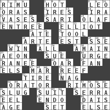 ACROSS 1. Tall New Zealand timber tree 5. Being at a high temperature 8. Lion 11. Mouths or openings 12. Angers 14. Retirement account (abbr.) 15. Flower holders 17. Indian skirt 18. Norwegian king 19. Main course 21. American author Paul (1891-1958) 23. Had dinner 25. Implement 26. Johnson of "Laugh-In" 27. Eastern Standard Time (abbr.) 28. Compass dir. 31. Victory 33. Everything 35. At full speed 37. A really long time 38. Institute legal proceedings 40. Goad 41. The wife of a rajah (variant) 43. Boat paddle 45. Air blower 46. Raised railways 47. Third mo. 50. Coral ridge 52. Become fatigued 53. Tired old horse 54. Speaker 56. Full of chinks, cracks, or crevices 61. A hard, heavy blow 62. Set or collection 65. Father Junipero _ 66. Snakelike fish 67. Inside; within (prefix) 68. Raised platform 69. Mature 70. Put into a specified state 71. Otherwise DOWN 1. Be footloose 2. SW Asia republic 3. Vertical spar for supporting sails 4. One who makes use of a thing 5. Part of HMS, perhaps 6. Mouth or opening 7. Cigar-shaped 8. _ and Stitch 9. Part of Q.E.F. 10. Clumsy lout 13. Grain storage towers 16. Dry up 18. Lubricate 20. Singer James 22. Globular water bottle used in Asia 24. Snakelike fish 26. Queen of England 1702-14 28. "Two Mules for Sister ____" 29. Omen 30. Compass dir. 31. Welt 32. Charged atoms 34. Nilotic language 36. Perform or handle clumsily 37. "We ___ not amused" (Victoria) 39. Merit 42. Send forth 44. Rump 48. Came up 49. Summer TV shows 51. The front part of a cuirass 52. Label 54. Cassini of fashion 55. Governing power 57. Ancient Persian 58. Spoken 59. Indian titles of respect 60. Comfort 61. Ocean 63. Binary compound 64. Small child