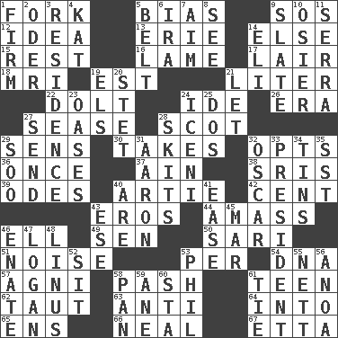 ACROSS 1. Tined utensil 5. Prejudice 9. Mayday 12. The content of cognition 13. One of the Great Lakes 14. Otherwise 15. Take ten 16. Unable to walk 17. Den 18. Medical imaging device (abbr.) 19. Eastern Standard Time (abbr.) 21. 61 cubic inches 22. Dunce 24. Binary compound 26. Period 27. Gospel singer Marvin 28. Native of Scotland 29. Elected reps. 30. Proceeds 32. Chooses 36. Single time 37. The 18th letter of the Arabic alphabet 38. Indian titles of respect 39. Lyric poems 40. Nick name for Arthur 42. Penny 43. Greek god of love 44. Collect or gather 46. Pipe bend 49. Elected rep. 50. Indian skirt 51. Annoying sound 53. For each 54. Heredity factor (abbr.) 57. Hindu god of fire 58. Romantic infatuation 61. Adolescent 62. Drawn tight 63. Opposed to 64. To the inside or interior of 65. Followers of ems 66. Be tempered by heat 67. Singer James DOWN 1. Become taut 2. River in Europe 3. Home 4. Krazy ___ of comics 5. Waist strap 6. Retirement account (abbr.) 7. Direct toward a target or goal 8. Observe 9. Chalkboard 10. Flexible twig of a willow tree 11. Father Junipero _ 14. Biblical high priest 19. Raised railways 20. Proofreading order 21. Allow 23. Fertile tracts in a desert 24. Ancient Celtic tribe of eastern Britain 25. Two (Sp.) 27. Post 28. Burlesque acts 29. "Barney Miller" actor Jack 31. Composer Copland 32. Motion picture award 33. Elected leader of a country 34. Metal containers 35. Fast jet (abbr.) 40. "We ___ not amused" (Victoria) 41. Comfort 43. Compass dir. 45. Spoil 46. Related on the mother's side 47. Utah city north of Ogden 48. "_ and Lucy" (Charlie Brown theme song) 52. Be seated 53. Silvers or Donahue 55. Remaining after all deductions 56. Small Philippine buffalo 58. Baking dish 59. A saturated hydrocarbon 60. R.R. building 61. Neckwear