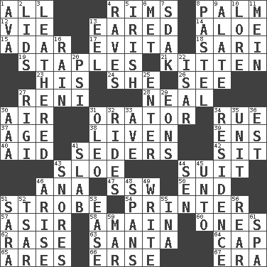 ACROSS 1. 100% 4. Basketball hoops 8. Inside of hand 12. Compete 13. Having ears or earlike features 14. Medicinal plant 15. The sixth month of the Jewish calendar 17. Webber/Rice musical 18. Indian skirt 19. Paper fasteners 21. Baby cat 23. Part of HMS, perhaps 24. A female animal or person 26. Perceive with the eye 27. Painter Guido (1575-1642) 28. Actress Patricia 30. Wind 31. Speaker 34. Sorrow 37. Ripen 38. Make or become more lively 39. Followers of ems 40. Assist 41. Spring feasts 42. Be seated 43. A type of plum 44. Costume for a special activity 46. Santa ___, CA 47. Compass dir. 50. Conclude 51. Disco prop 54. Hard copy producer 57. SW Saudi Arabia district 58. With great haste 60. Washington bills 62. To erase 63. Before Barbara or Clara 64. Head covering 65. Ancient Greek god of war 66. Celtic language 67. Period DOWN 1. Actress Gardner 2. Flaplike coverings 3. Resembling or made to resemble leather 4. All-night dance parties 5. From or relating to Ireland 6. Was introduced to 7. Neighbor of Neb. 8. Soft color 9. Having winglike extensions 10. Old wives' tales, e.g. 11. Count _ (2 wds.) 13. Snakelike fish 16. Precipitation 20. 23rd letter of the Greek alphabet 22. Austrian river, tributary to the Danube 25. Keyboard key 27. Swiss mountan, "Queen of the Mountains" 29. Immeasurably long periods of time 30. Auto club (abbr.) 31. Margarine 32. Amusement-park features 33. "___ Maria" 34. Home 35. A single undivided whole 36. Eastern Standard Time (abbr.) 41. Broad, flat, thick piece 43. Sounds asleep 44. Elected rep. 45. To (old English) 46. Originate 48. Connects, as a bridge 49. Compose 51. "Two Mules for Sister ____" 52. Russian ruler of old 53. Comfort 55. _ tizzy (2 wds.) 56. Bring up, as a child 59. Impair 61. Health resort