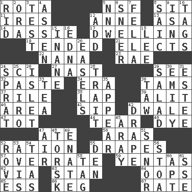 ACROSS 1. Roll call or roster of names 5. Overdraft (abbr.) 8. Be seated 11. Angers 12. Queen of England 1702-14 13. White ___ sheet 14. Small ungulate mammals of Africa 17. Home 19. Watched over 21. Opts 22. Grandmother 23. Actress Charlotte 24. _-fi 27. Political cartoonist Thomas 29. Perceive with the eye 32. Thick mixture 34. Period 36. Scottish caps 37. Cause heat under the collar 38. Pet locale 39. Set down 40. Length times width 41. Small drink 42. A sleeping potion; an opiate (poet.) 43. Small child 44. Separate forcefully 46. Color 47. Had dinner 50. Caspian sea tributary 52. Food allowance for one day 55. Window treatments 57. Make much ado about nothing 59. Gossips 62. By way of 63. Comedian Laurel of Laurel & Hardy 64. I made a mistake 65. Curvy letter 66. Barrel 67. Assign a rank or rating to DOWN 1. To free from 2. Mouth or opening 3. Trial 4. NE Netherlands city 5. Compass dir. 6. Contemptuous expression 7. Chap (slang) 8. Ketch in the Levant 9. Is not 10. Labels 12. Increase 15. Lacking in sense or substance 16. Pulitzer Prize-winning author Ferber 18. Area sheltered from the wind 20. Artist's stands 24. Small fatty European fish 25. Capital of Egypt 26. Small island 28. Distinguishing feature 29. First course 30. Poet Dickinson 31. First name in cosmetics 33. Beverage made from leaves 35. Seem 36. The 23rd letter of the Hebrew alphabet 42. Window treatment 45. Like ___ of sunshine 47. Atmosphere 48. Cod relative 49. Related on the mother's side 51. Sir (Sp.) 52. Be footloose 53. Opinion 54. Beverages made from leaves 55. Lair 56. Portico 58. Label 60. Fitting 61. Compass dir.